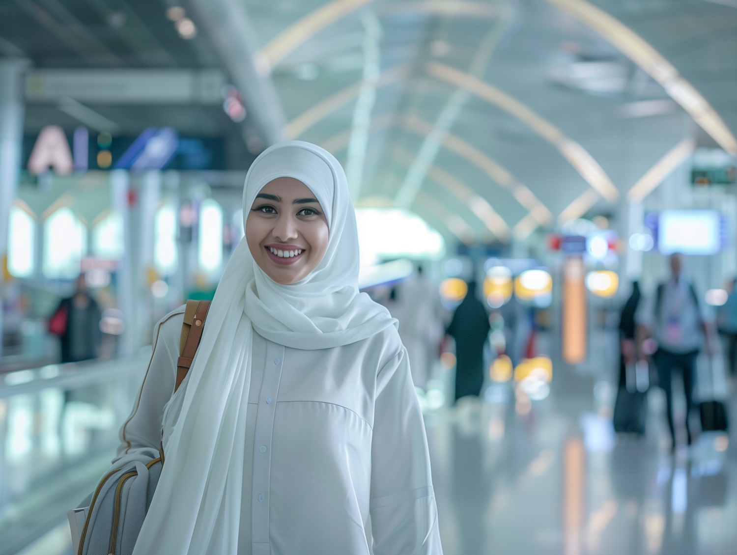 Smiling woman in white hijab at a modern airport terminal, carrying a beige bag. Bright, airy atmosphere with blurred travelers in the background.