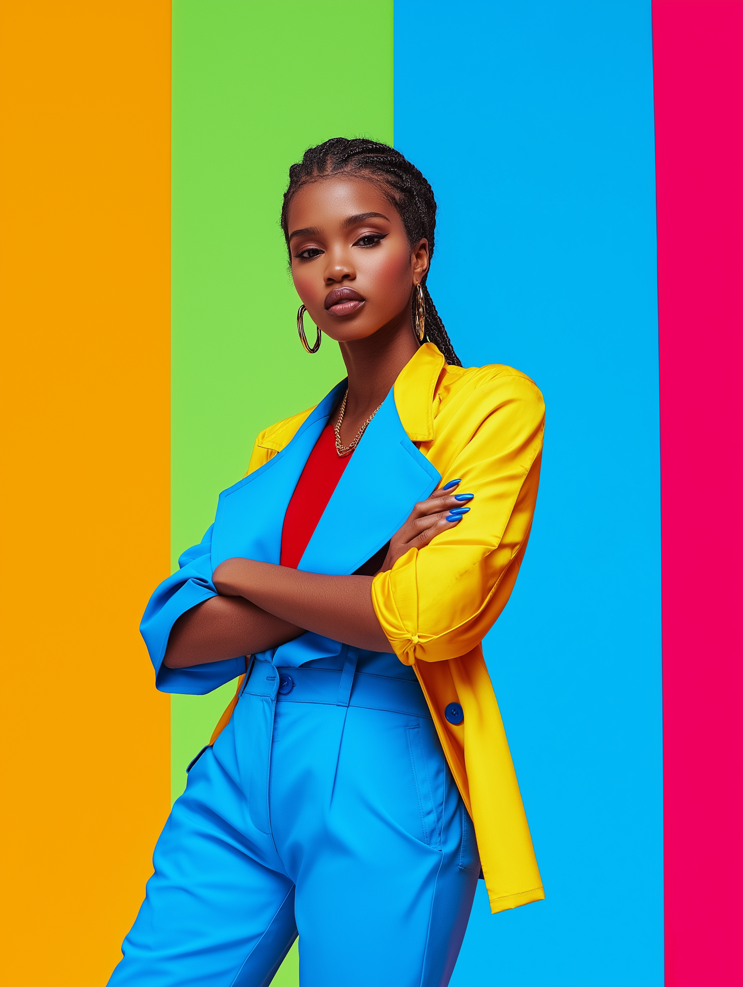 Stylish Black woman in vibrant yellow and blue outfit against a colorful striped background, exuding confidence and modern fashion.