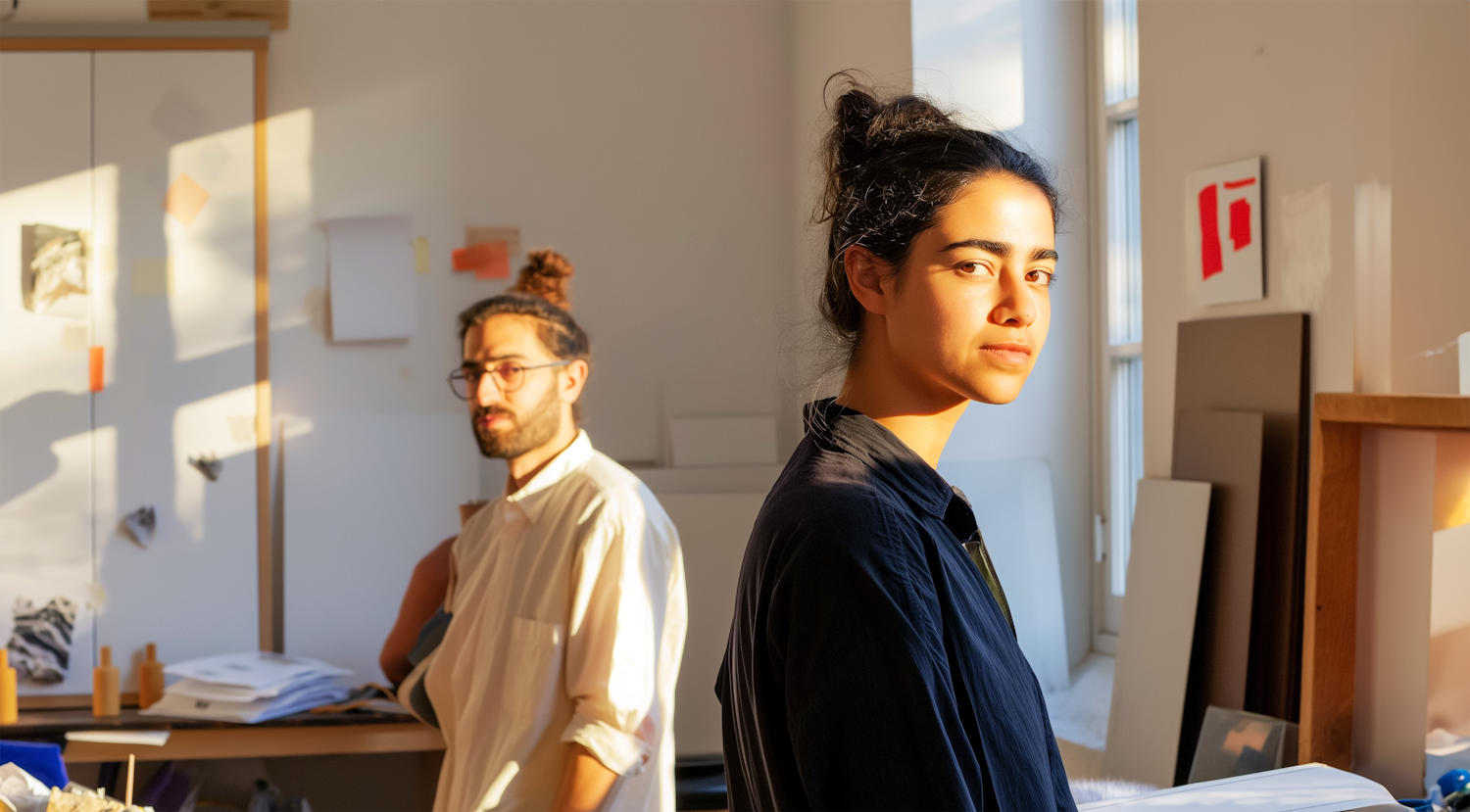 Two people in a sunlit studio, one in focus with a calm expression, surrounded by art materials and warm natural light.