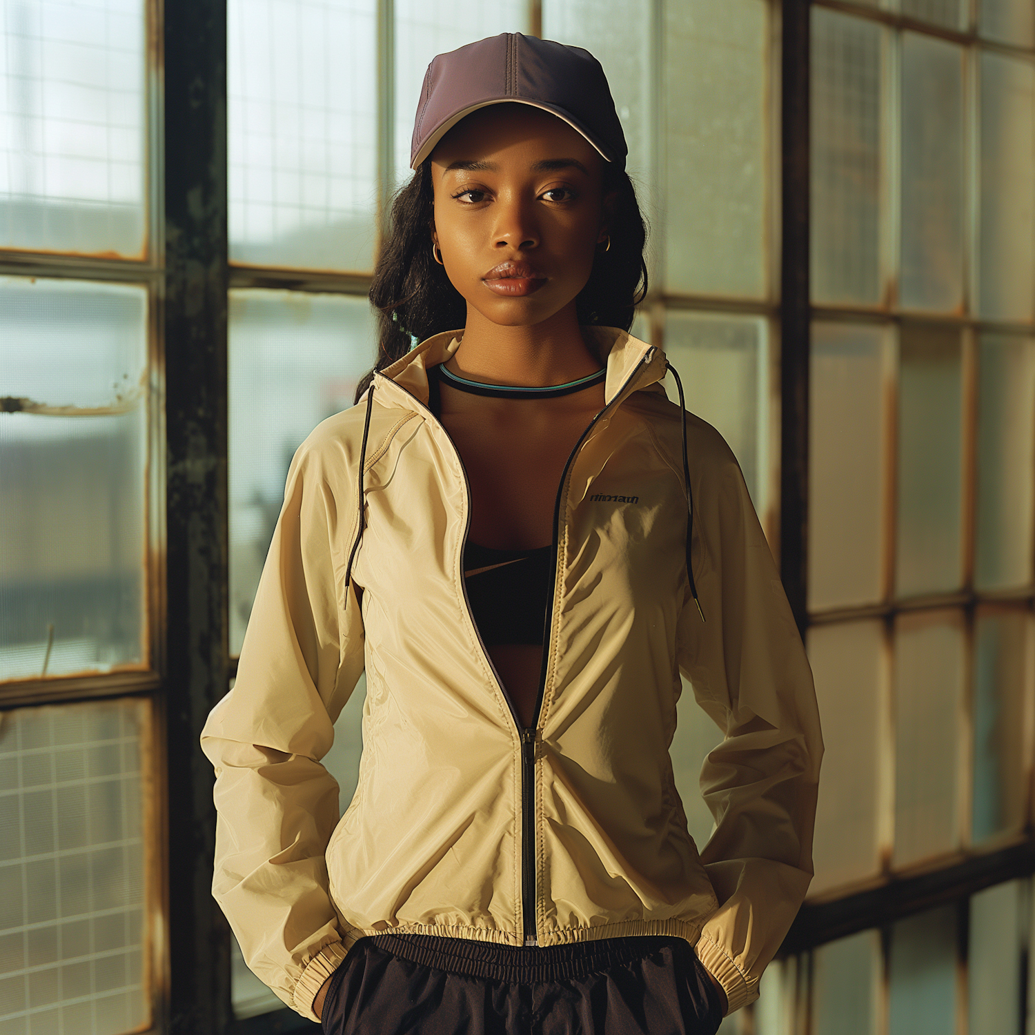Young woman in a beige windbreaker and purple cap stands confidently by a window, exuding calm and style.