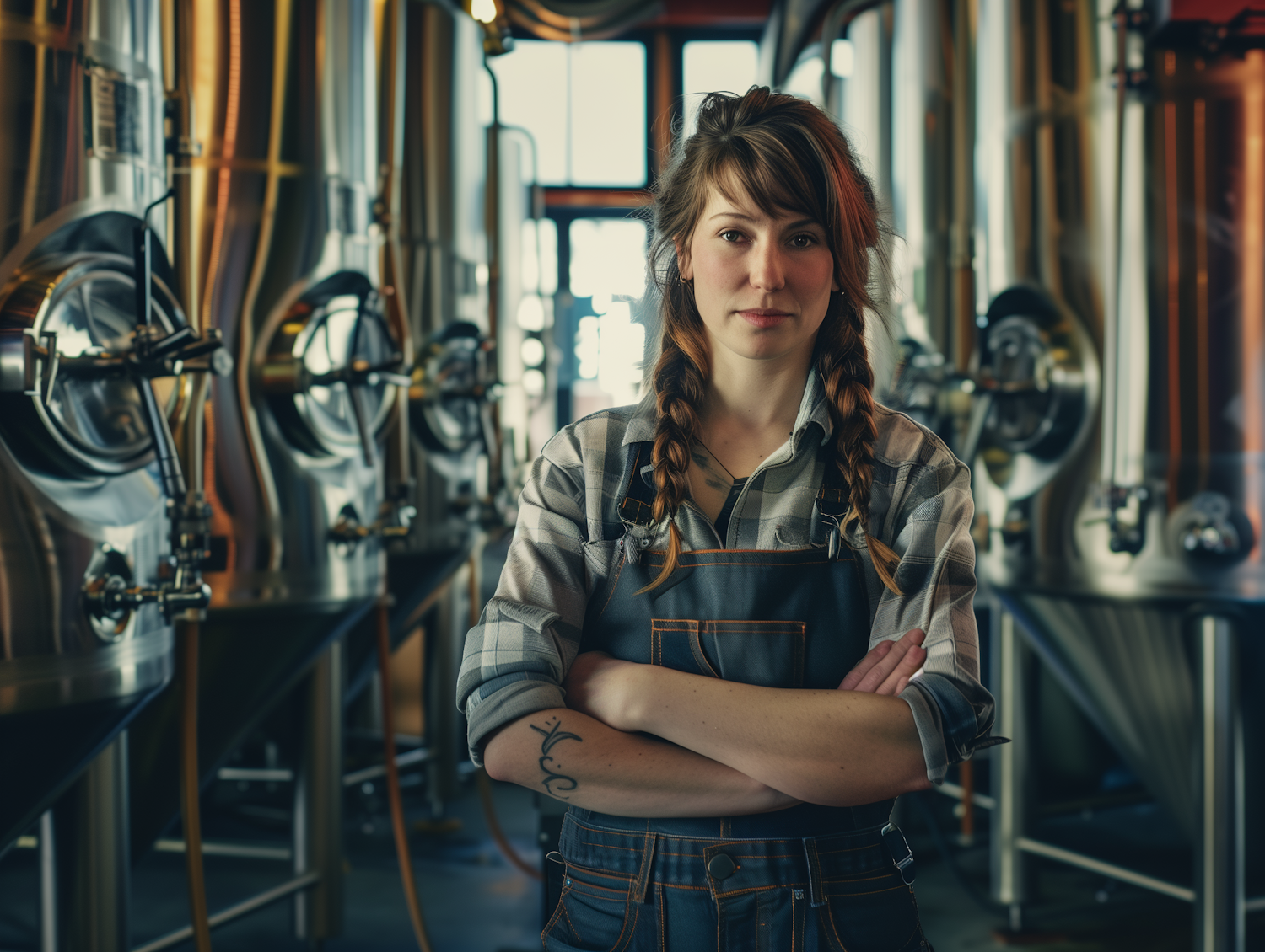 Confident female brewer in plaid shirt and overalls stands in a brewery, surrounded by stainless steel tanks.