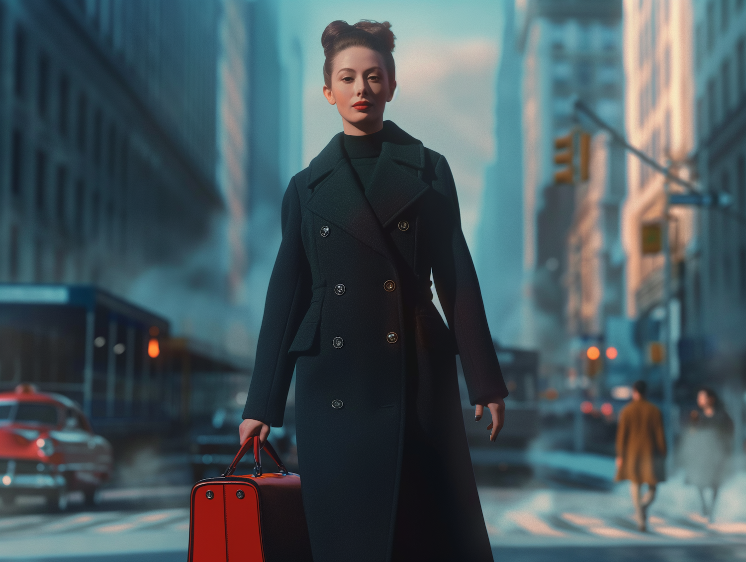 Elegant woman in a dark coat with a red suitcase stands confidently in a bustling city street.