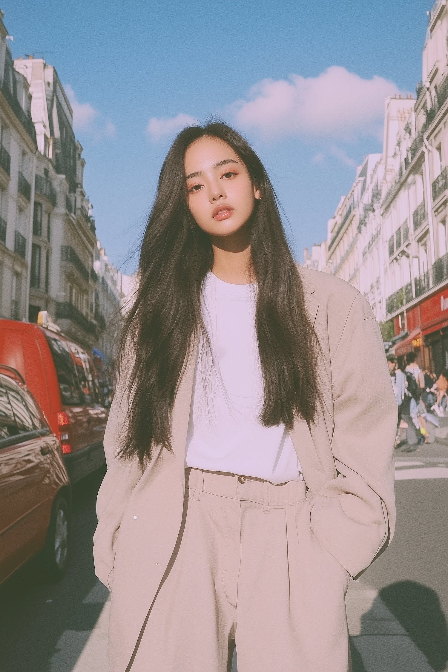 Stylish Asian woman in beige suit poses confidently on a city street with European architecture and a bright blue sky.