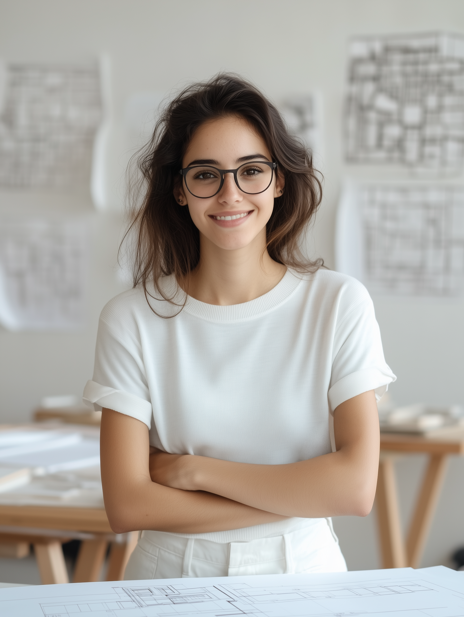 Smiling woman with glasses in a bright room, surrounded by architectural plans, exuding confidence and creativity.