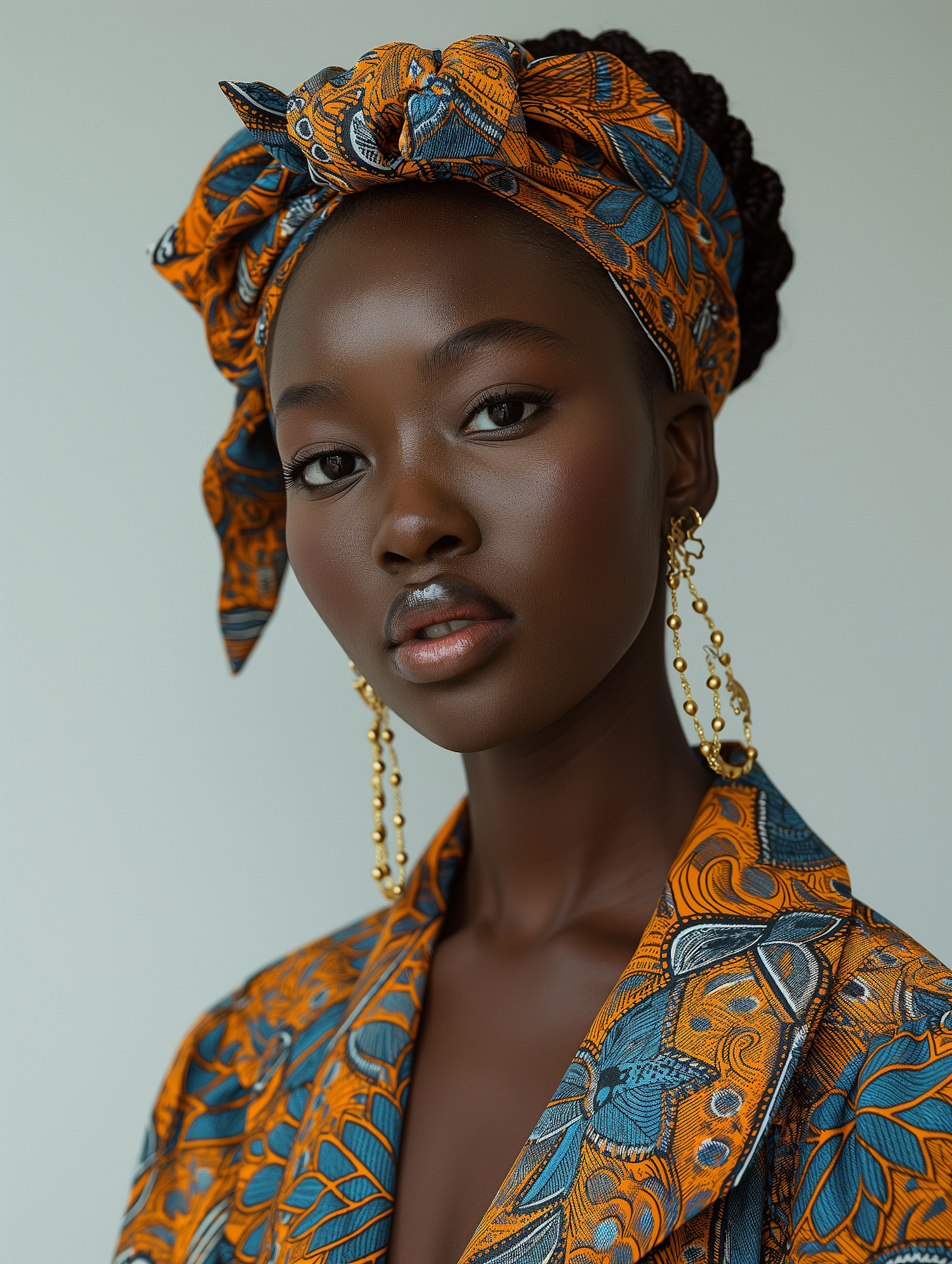Elegant portrait of a young Black woman in vibrant orange and blue attire, with matching headscarf and gold earrings, exuding confidence.