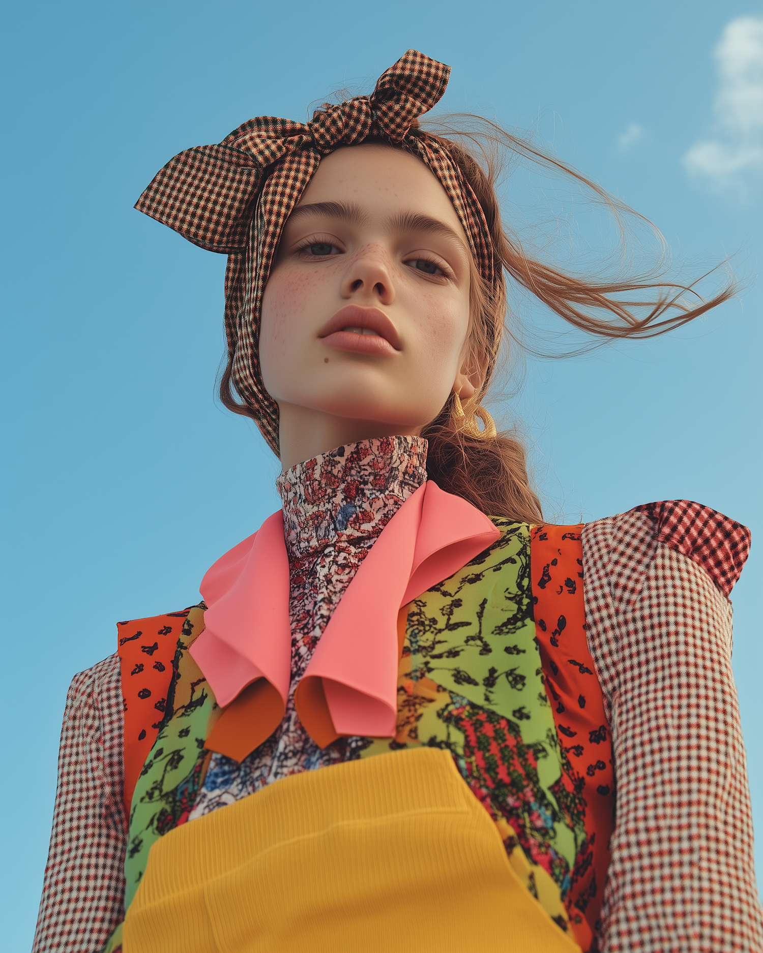 Stylish young woman in vibrant, eclectic fashion with a gingham headscarf, posing confidently against a clear blue sky.