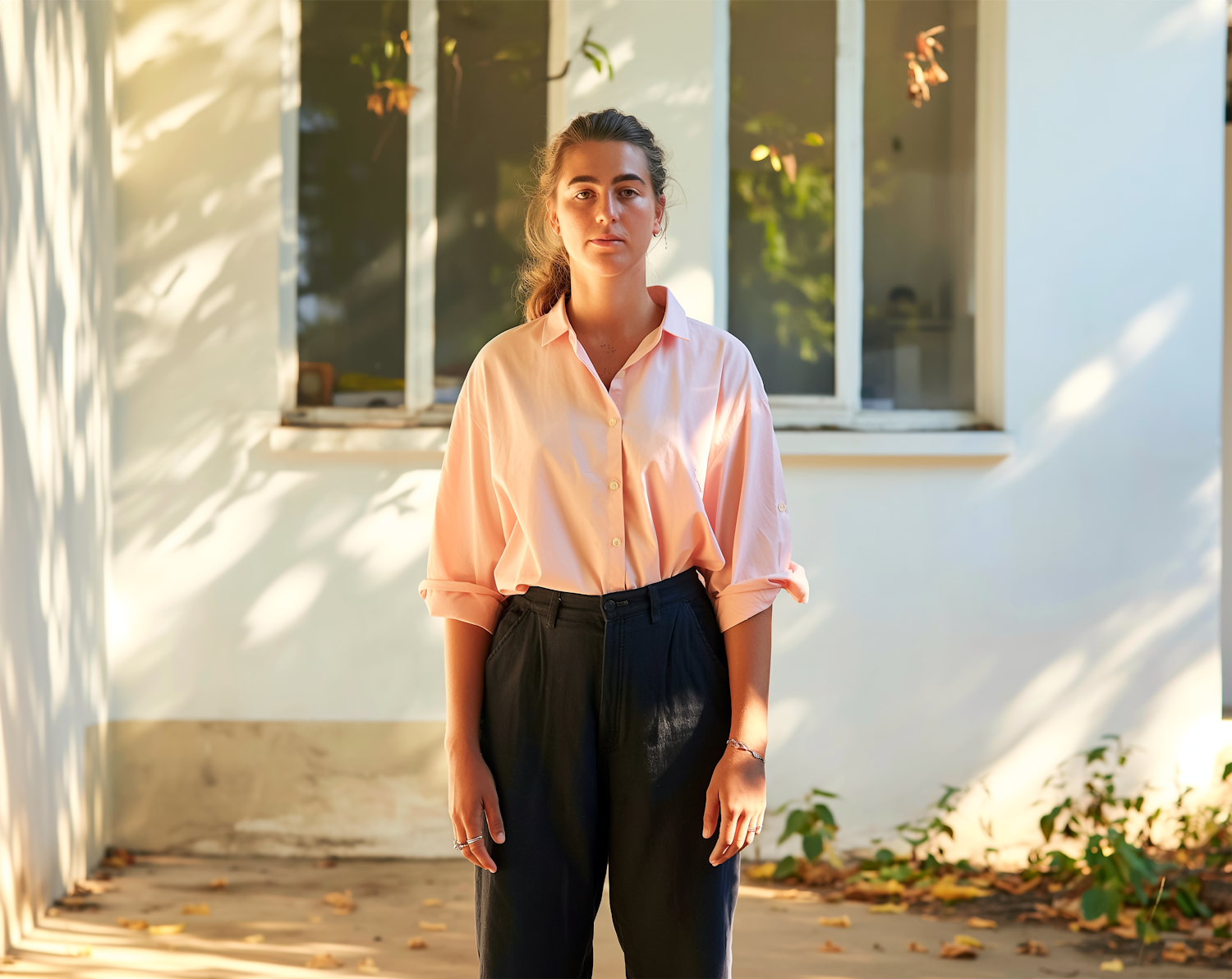 Young woman in pink shirt and black trousers stands outdoors by a white building, with sunlight casting dappled shadows.