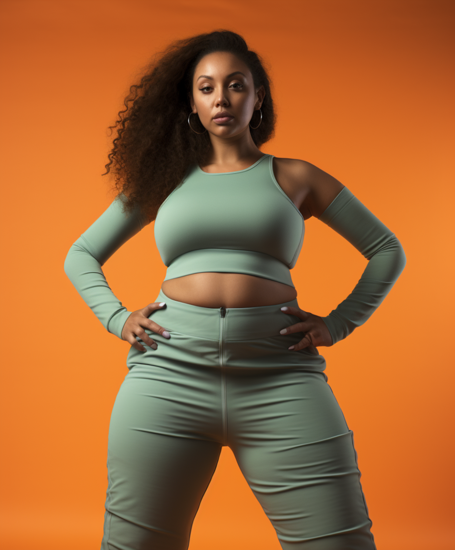 Confident woman in a stylish green outfit poses against a vibrant orange background, exuding strength and elegance.