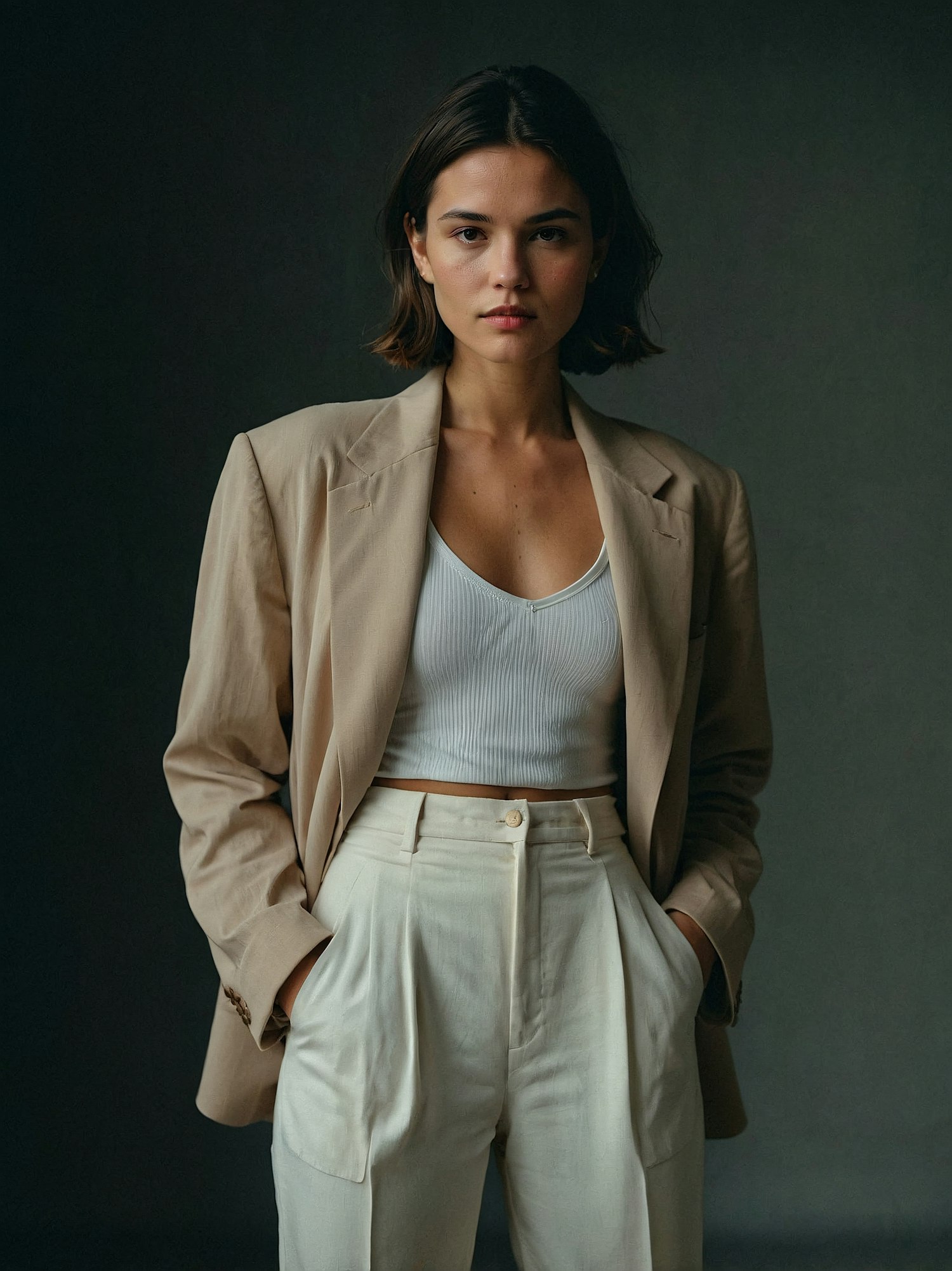 Stylish woman in beige blazer and cream trousers, exuding confidence with a calm expression against a dark background.