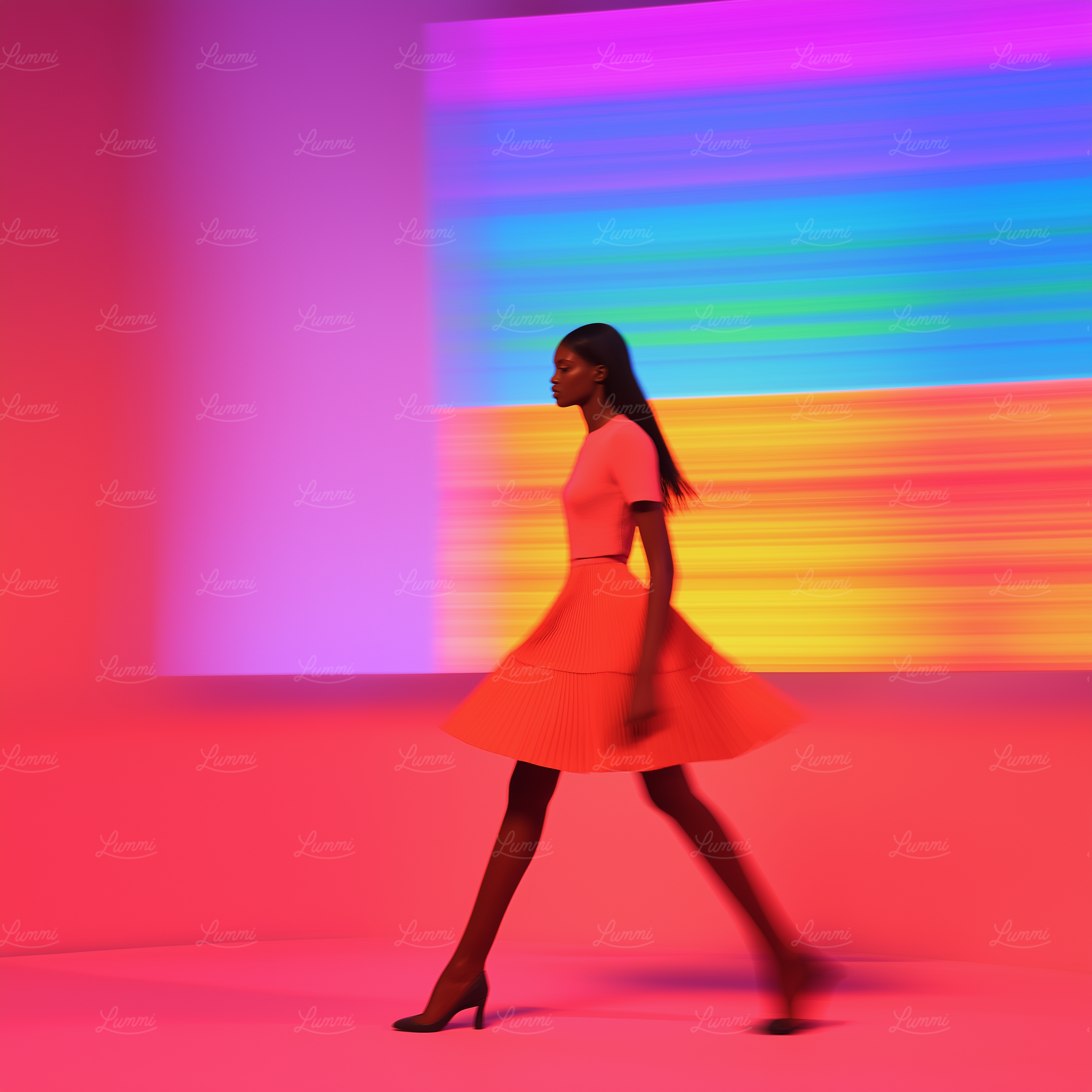 A woman in a bright orange dress walks against a vibrant, colorful background, exuding confidence and style.
