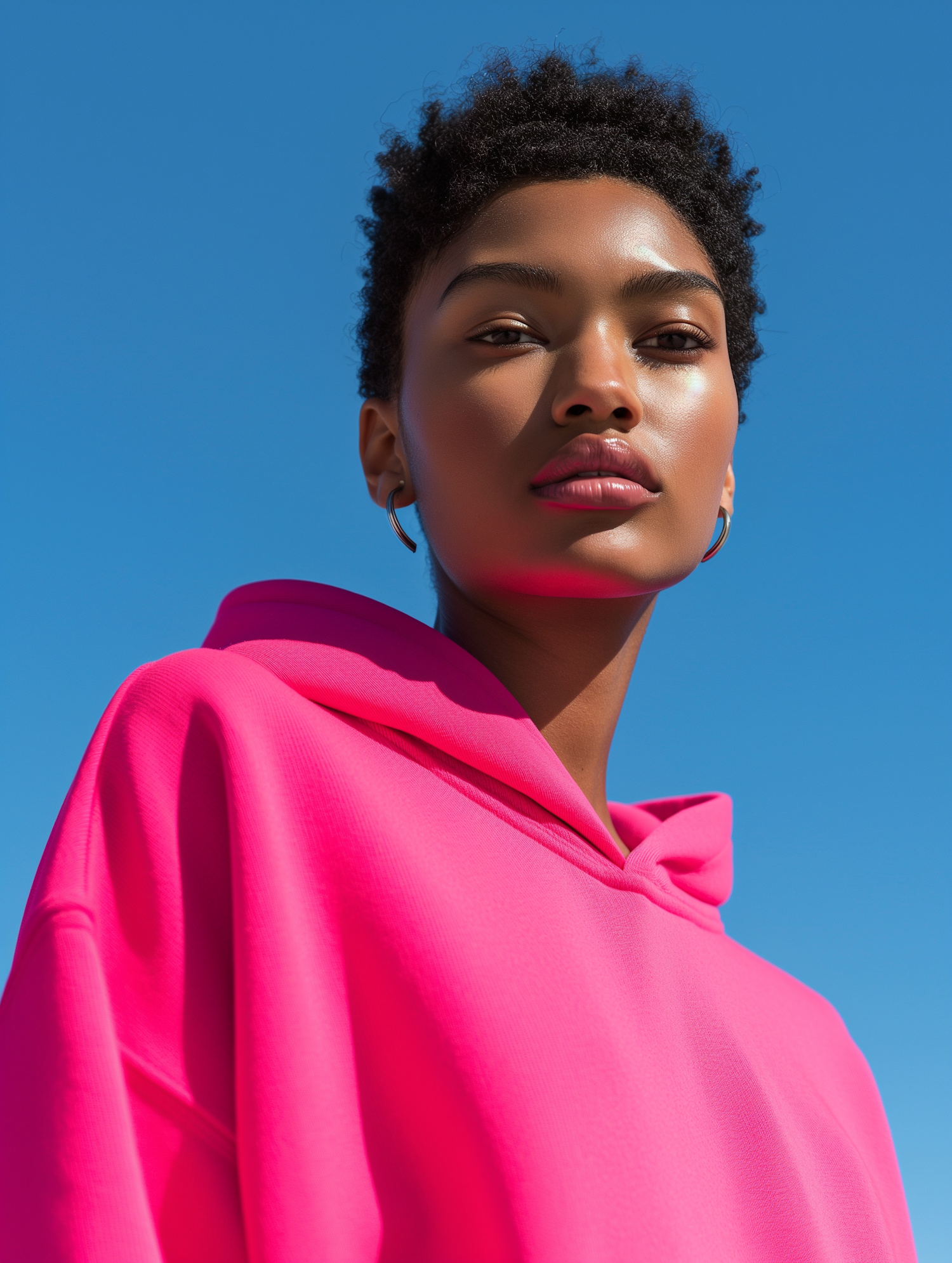Confident woman in a vibrant pink hoodie against a clear blue sky, showcasing bold colors and a serene expression.