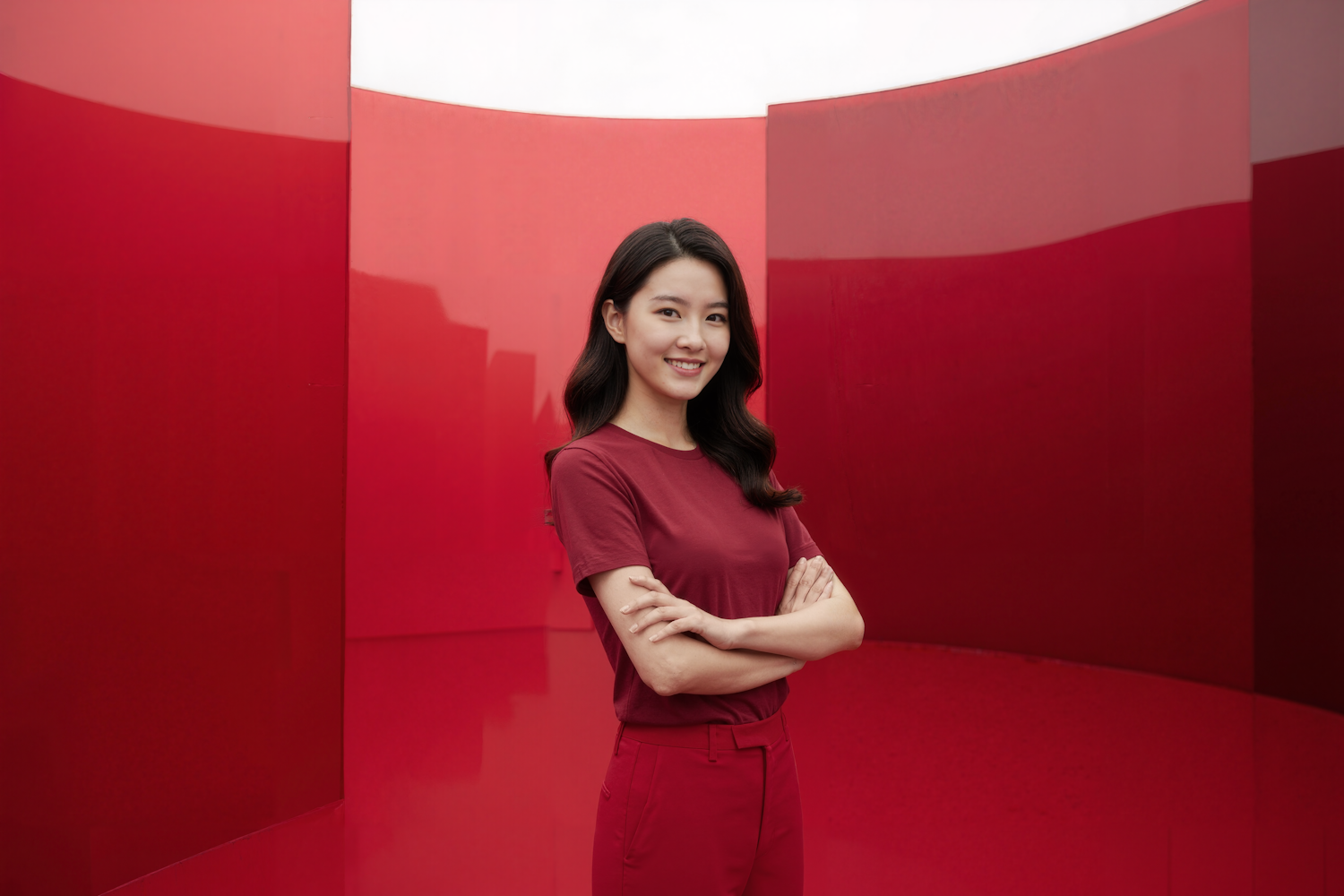 A woman in a red outfit stands confidently against a vibrant red background, smiling warmly with arms crossed.