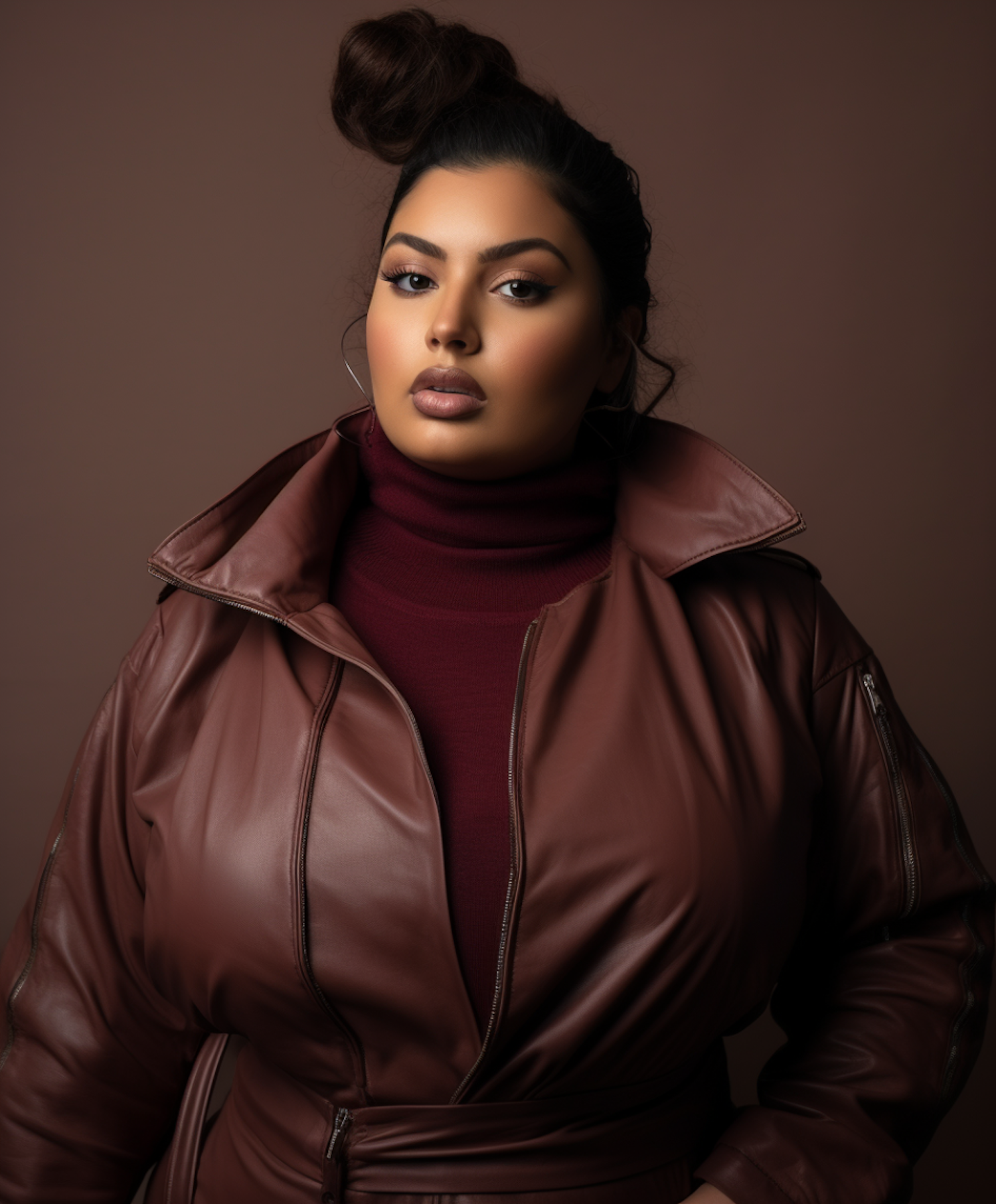 Confident woman in brown leather jacket and burgundy turtleneck against a warm brown background, exuding elegance and style.