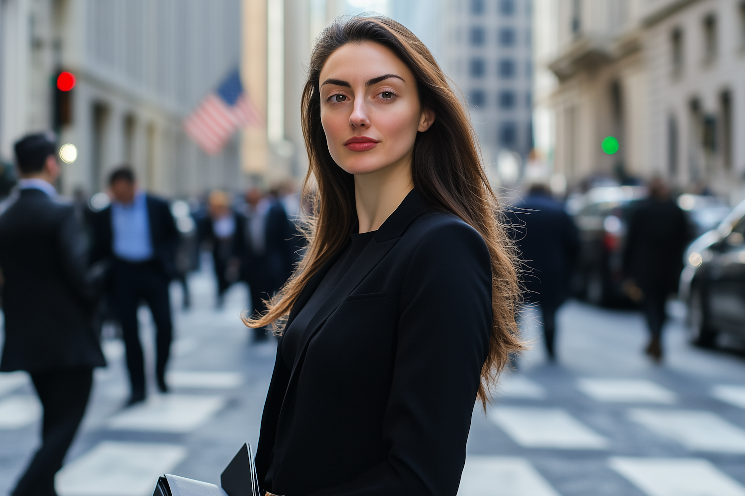 Confident woman in a black blazer stands in a busy city street, exuding professionalism and poise amidst urban hustle.