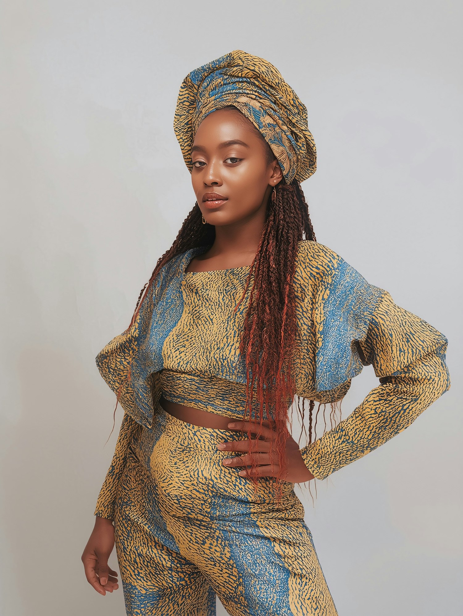 Stylish woman in a vibrant yellow and blue patterned outfit with matching headwrap, posing confidently against a plain background.