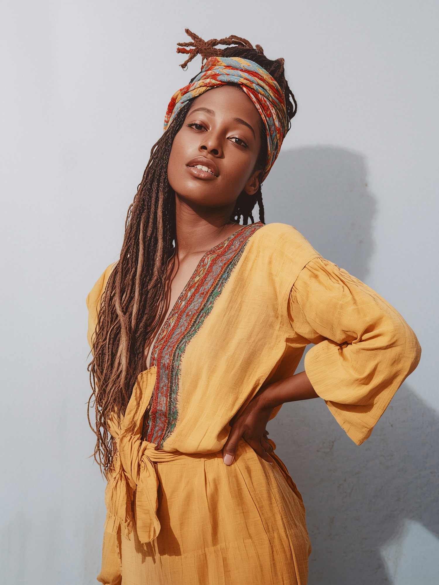 Stylish woman in a yellow embroidered dress and colorful headwrap, posing confidently against a light background.