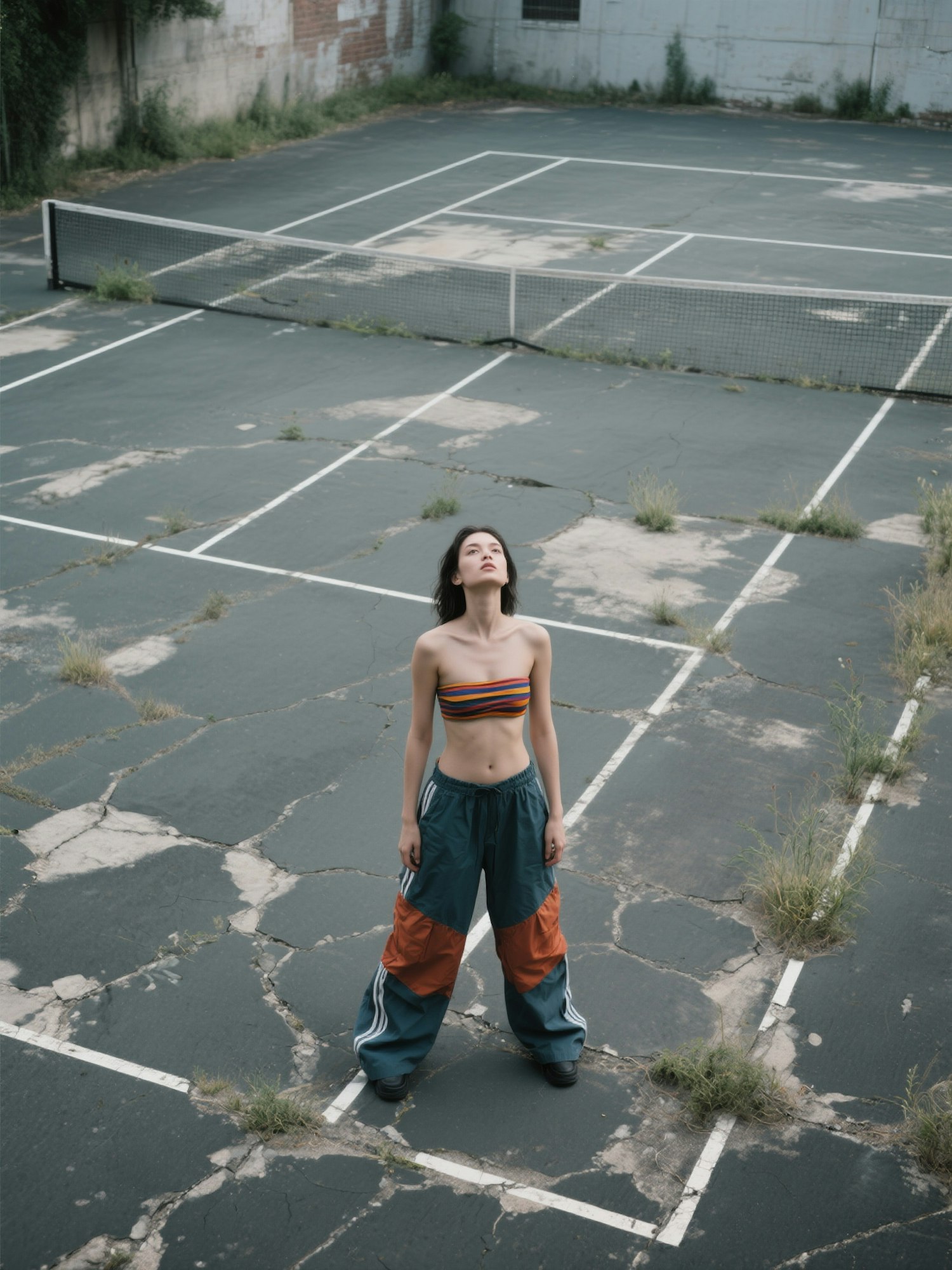 Abandoned tennis court — one model standing in the center of the cracked court in a tube top and parachute pants. Styled like Nylon’s athletic-trash fashion edits. No activity, no props, no headphones — still and cinematic.