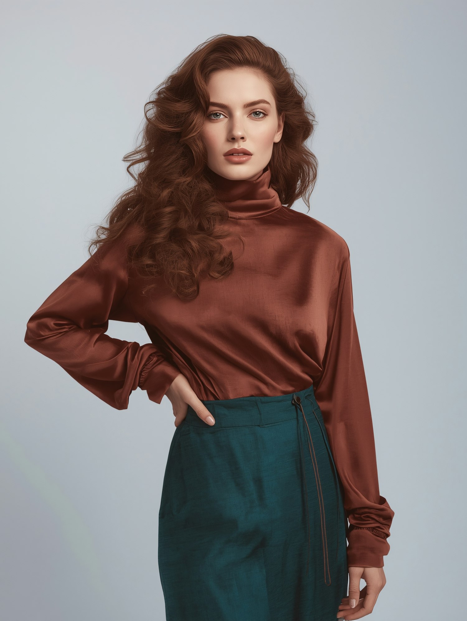 Stylish woman in a rust turtleneck and teal skirt, showcasing elegant fashion with soft lighting and a neutral background.