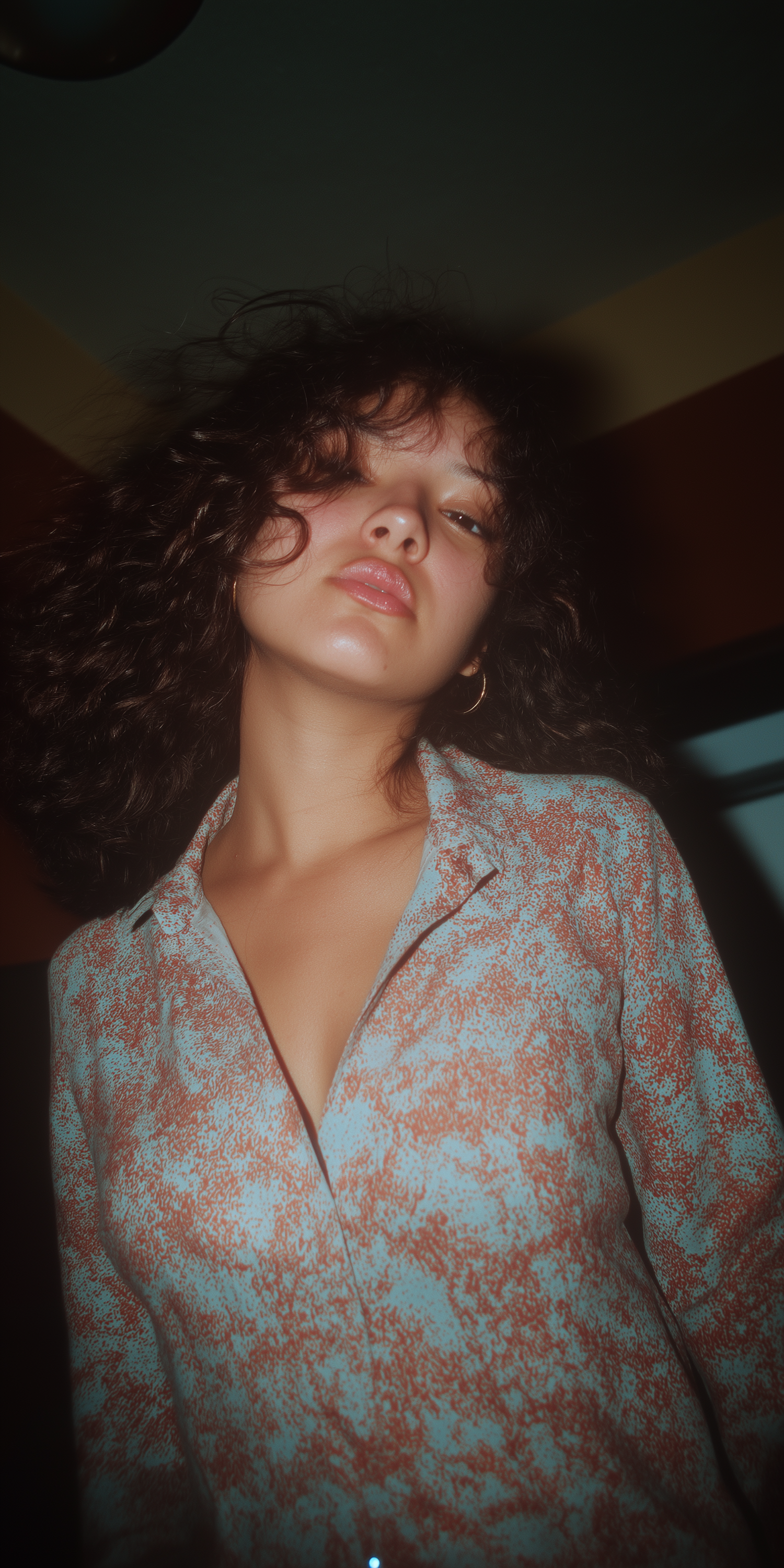 A young woman with curly dark hair and a patterned shirt poses confidently under warm, moody lighting.