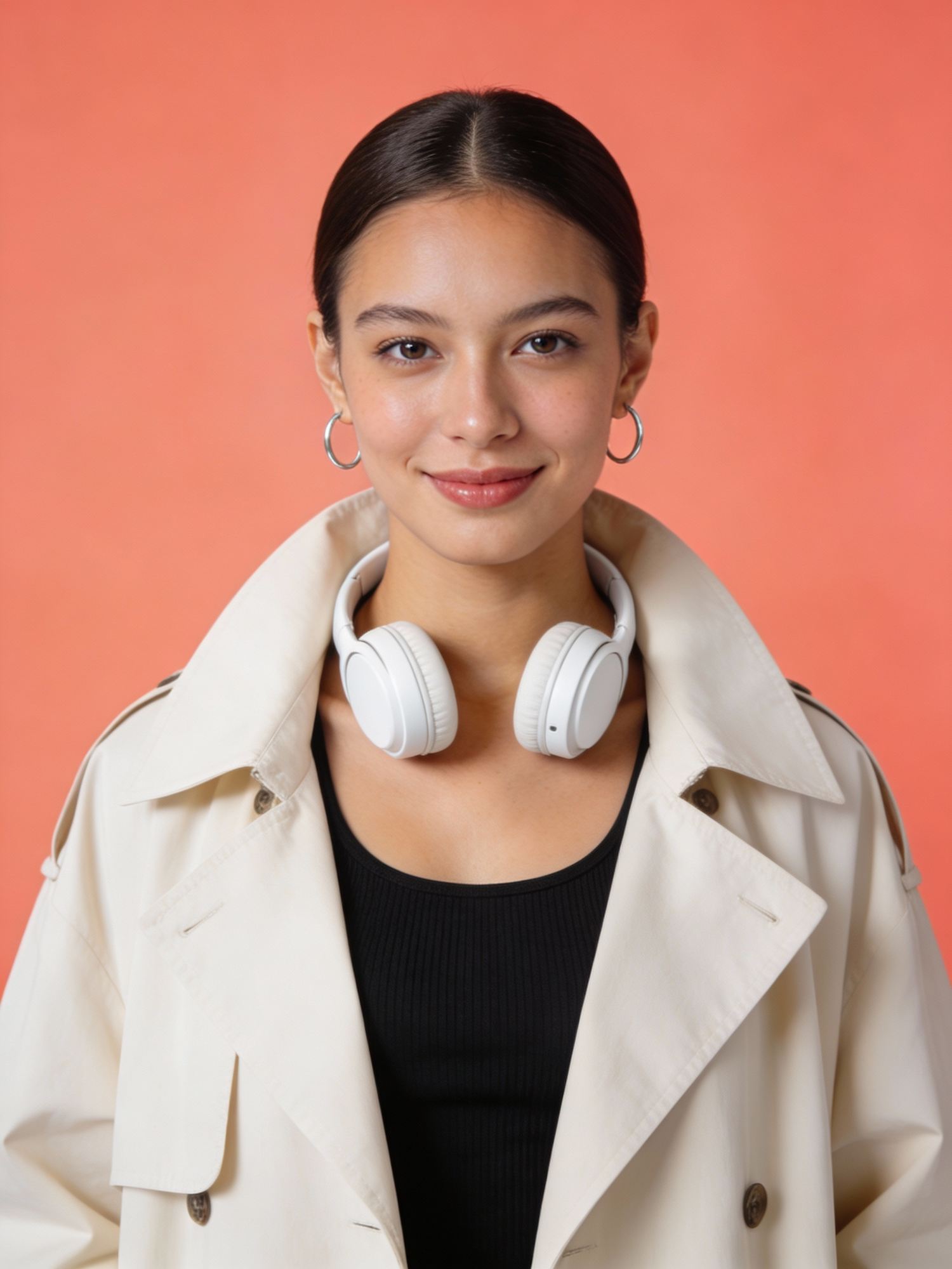A young woman with headphones and a trench coat smiles warmly against a coral background, exuding a modern and stylish vibe.