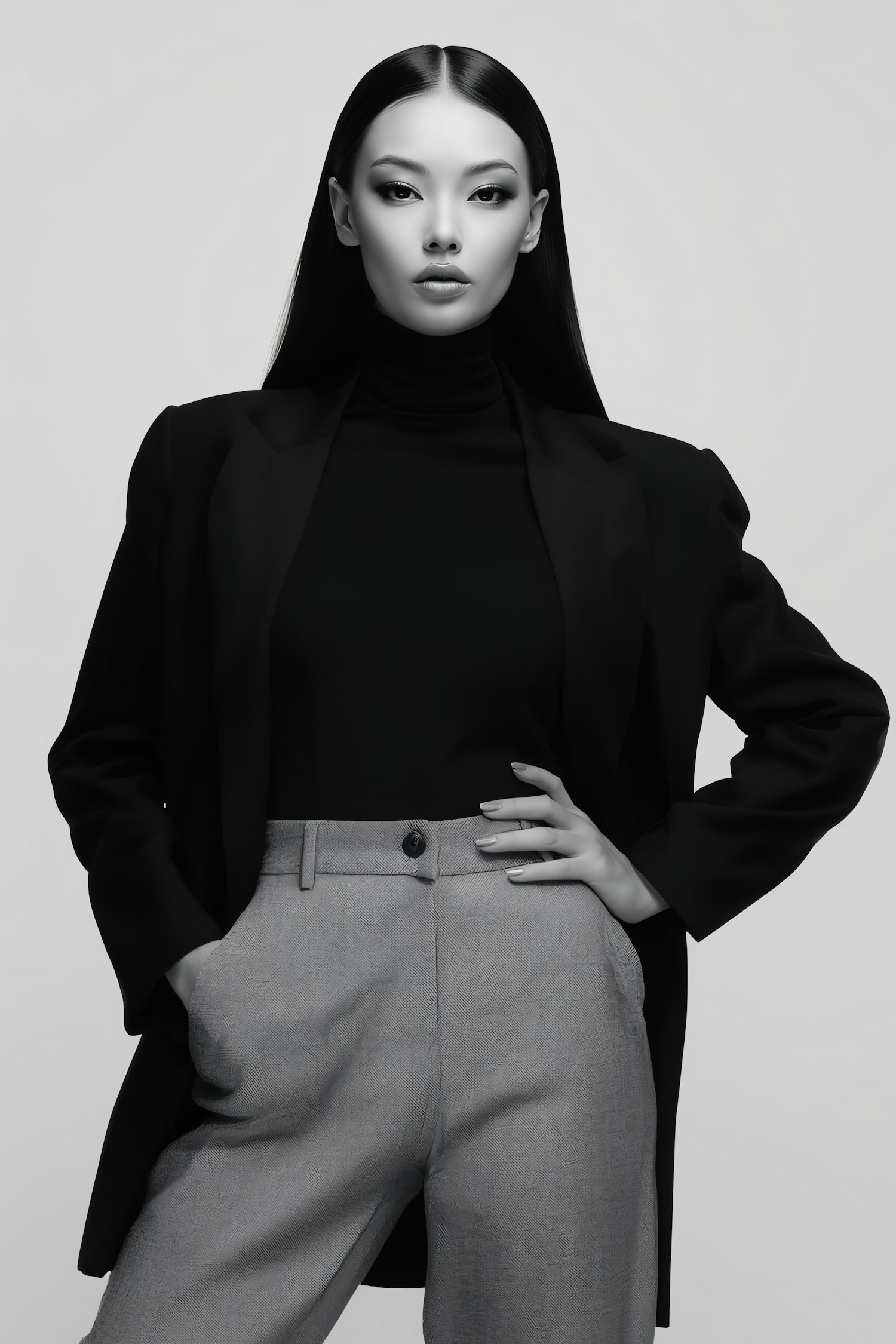 Monochrome portrait of a confident woman in a blazer and trousers, showcasing a modern and professional style.