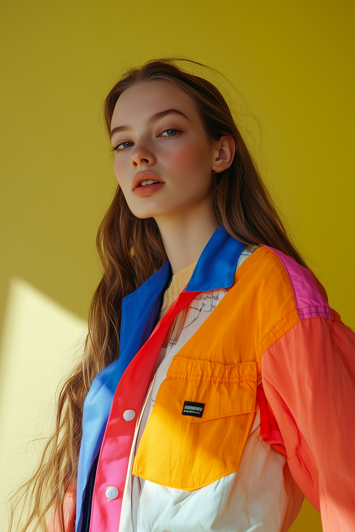 Stylish woman in a vibrant color-blocked jacket against a bold yellow background, showcasing modern fashion and confident vibes.