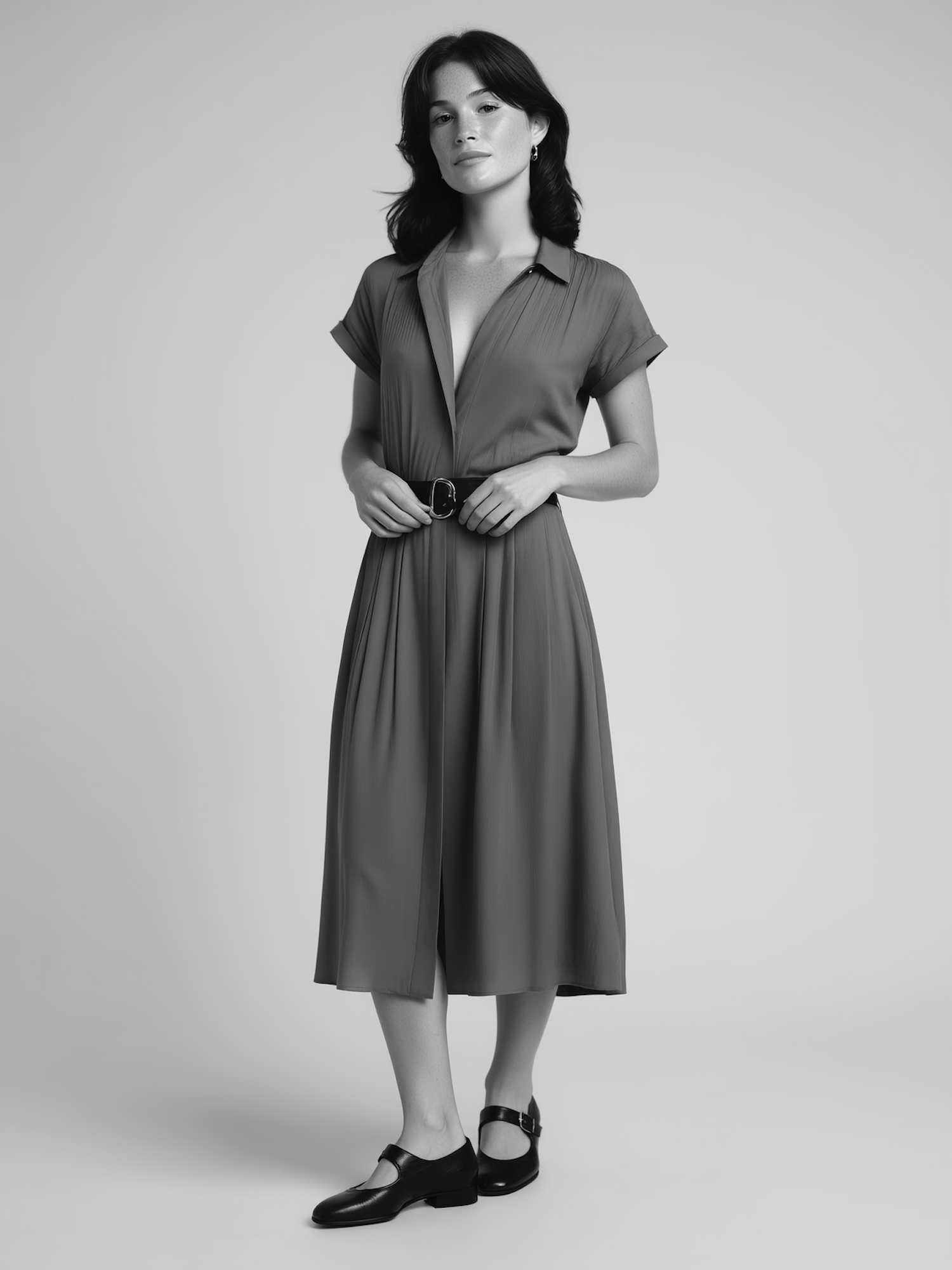 Monochrome portrait of a woman in a belted dress, standing confidently against a plain background.