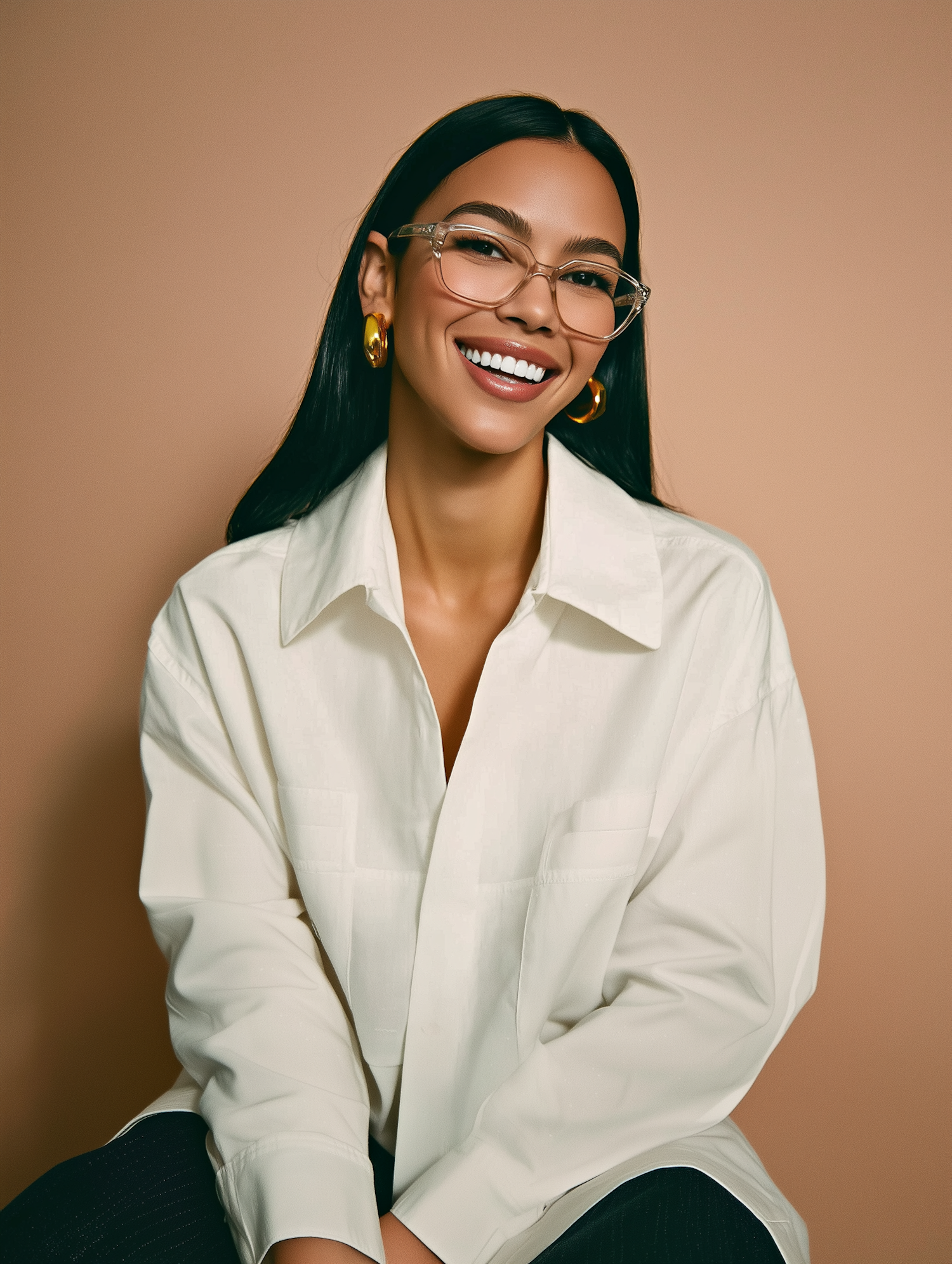 A cheerful woman with glasses and gold earrings, wearing a white shirt, smiles warmly against a beige background.