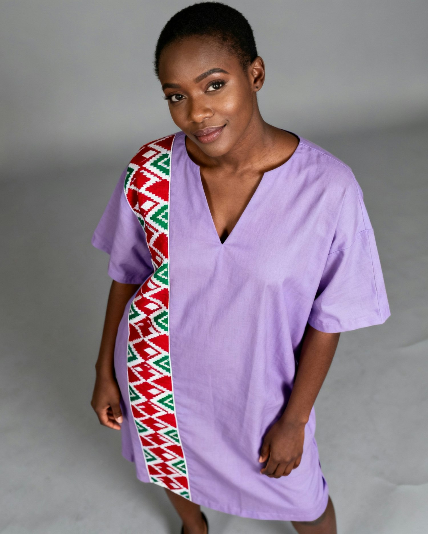 Full-body, high-definition portrait of a stylish Black woman wearing a loose-fitting lavender dress with a bold geometric panel in red, white, and green along one side. The dress features a V-neck and short sleeves, blending traditional textile motifs with modern silhouette design. She stands confidently with a composed expression. The neutral gray background enhances the purple tones of her outfit, making the layered textures stand out. Lighting is soft and directional, casting subtle highlights across her skin and garment. The overall mood is modern, modest, and editorially sharp—ideal for a Gen Z fashion portrait or Afro-fusion identity showcase.
