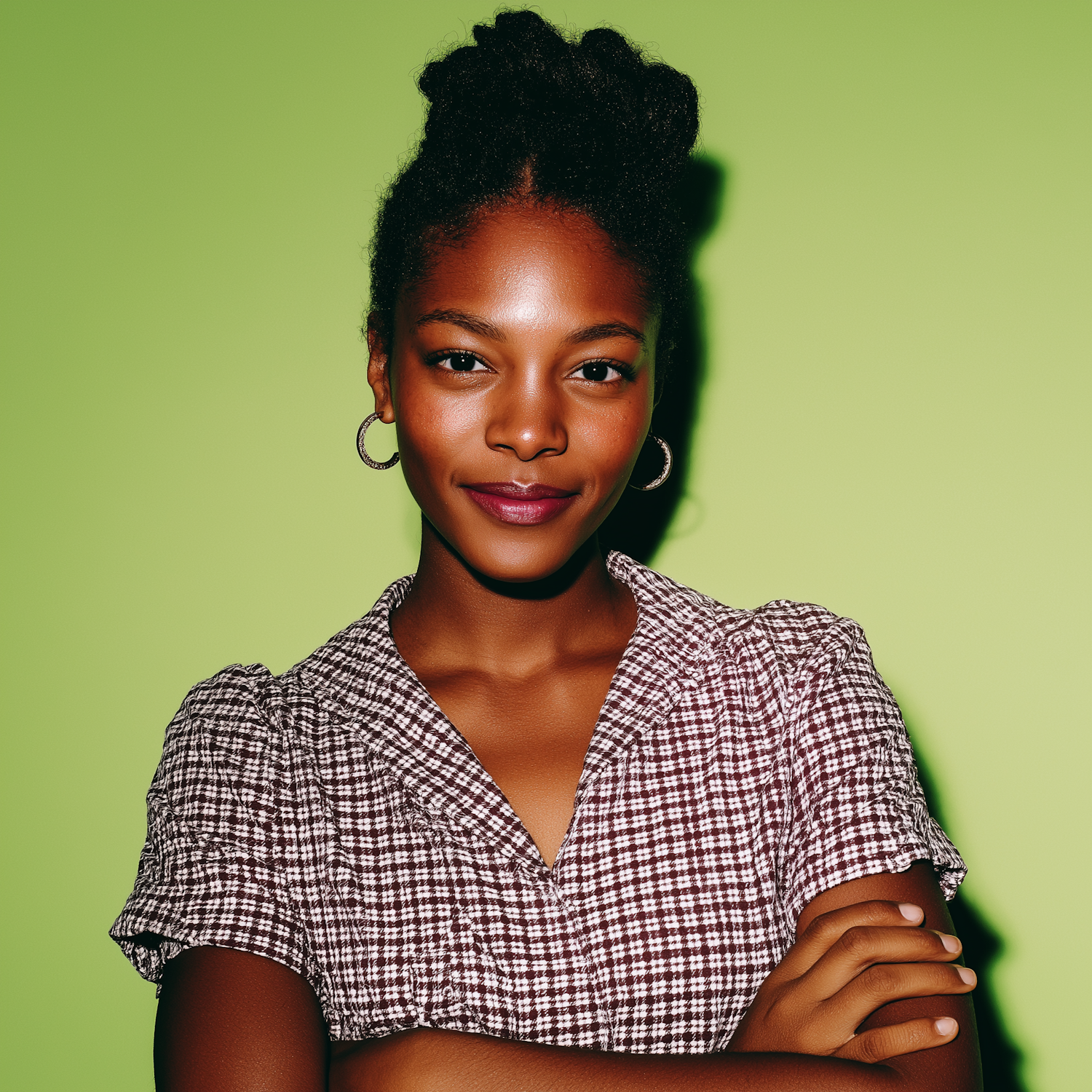 Confident woman with natural hair in a checkered blouse, standing against a bright green background, exuding a vibrant and stylish vibe.