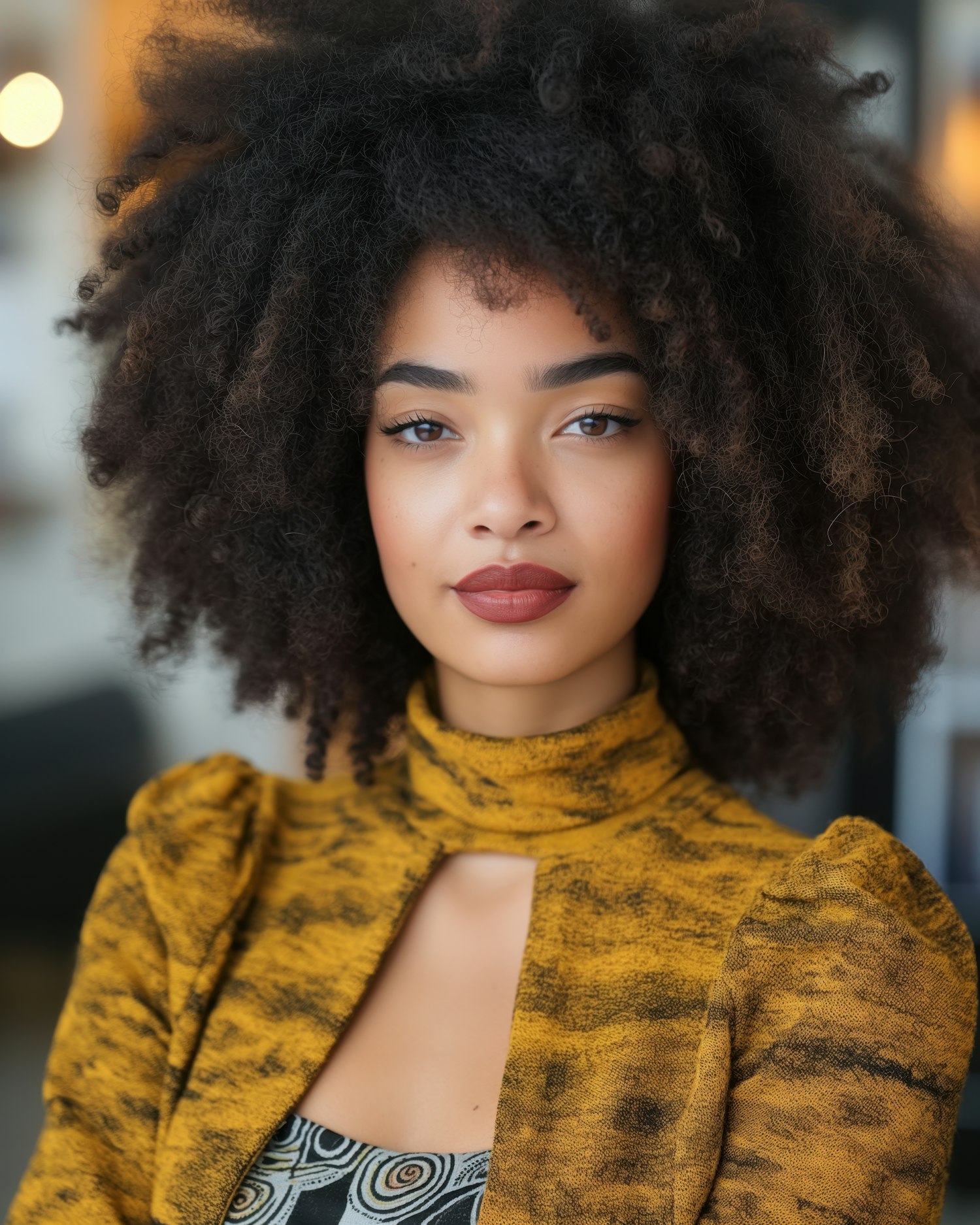 Confident woman with natural curly hair, wearing a mustard yellow top and deep red lipstick, in a softly lit indoor setting.