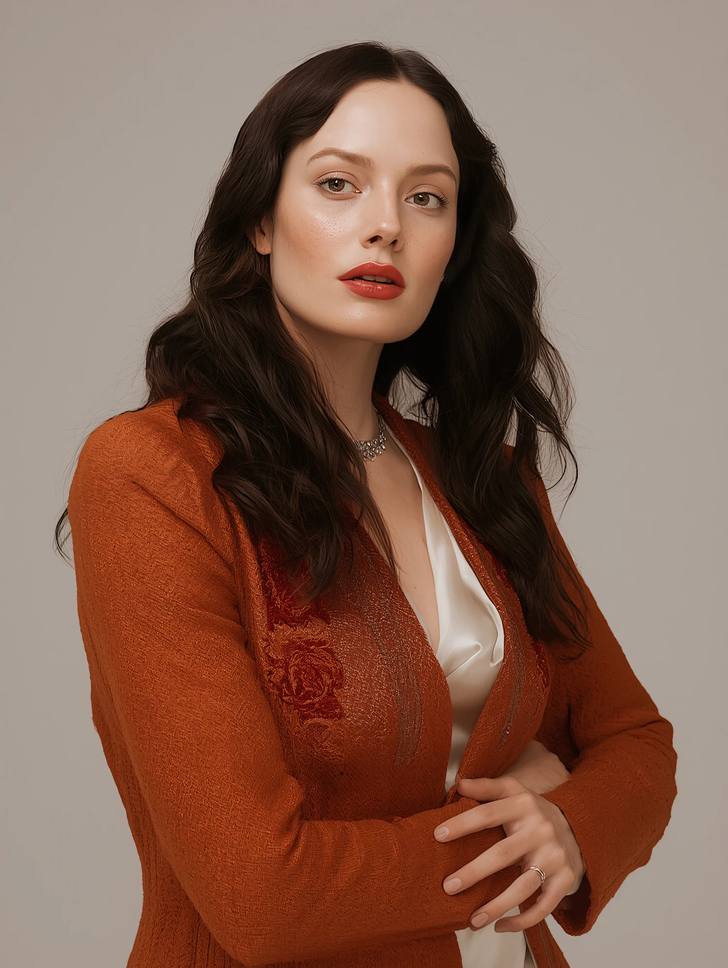 A woman with long dark hair in an orange jacket and white blouse poses confidently against a neutral background.