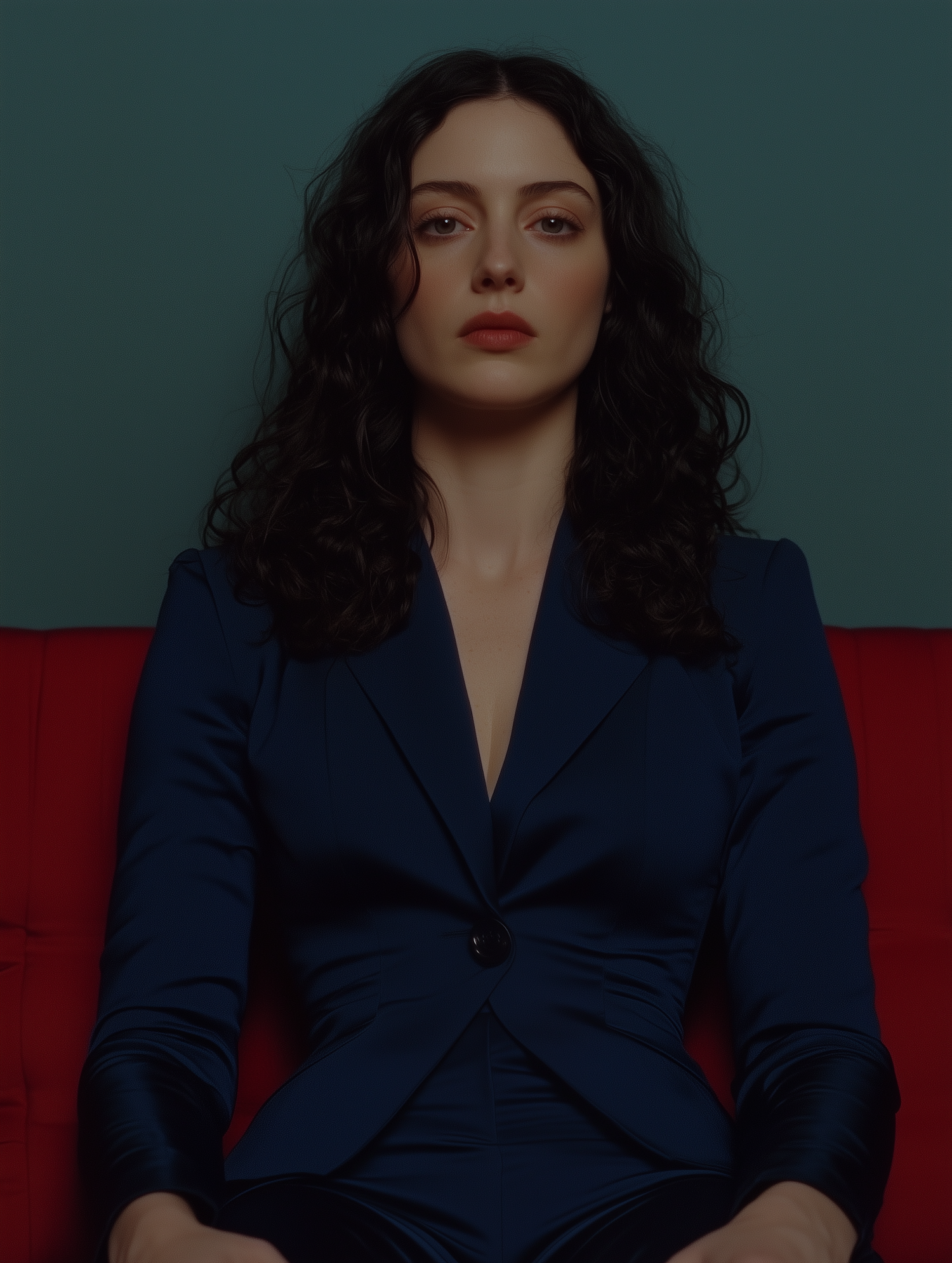 A woman with dark wavy hair in a navy blazer sits against a teal background on a red chair, exuding a composed and confident demeanor.