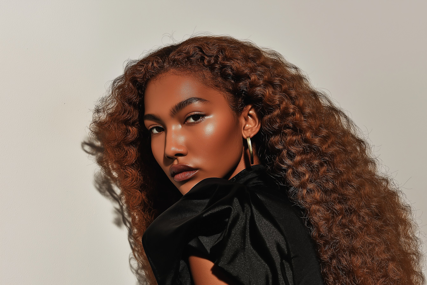 A stunning portrait of a woman with voluminous curly hair, gold hoop earrings, and a sleek black outfit, set against a plain background.