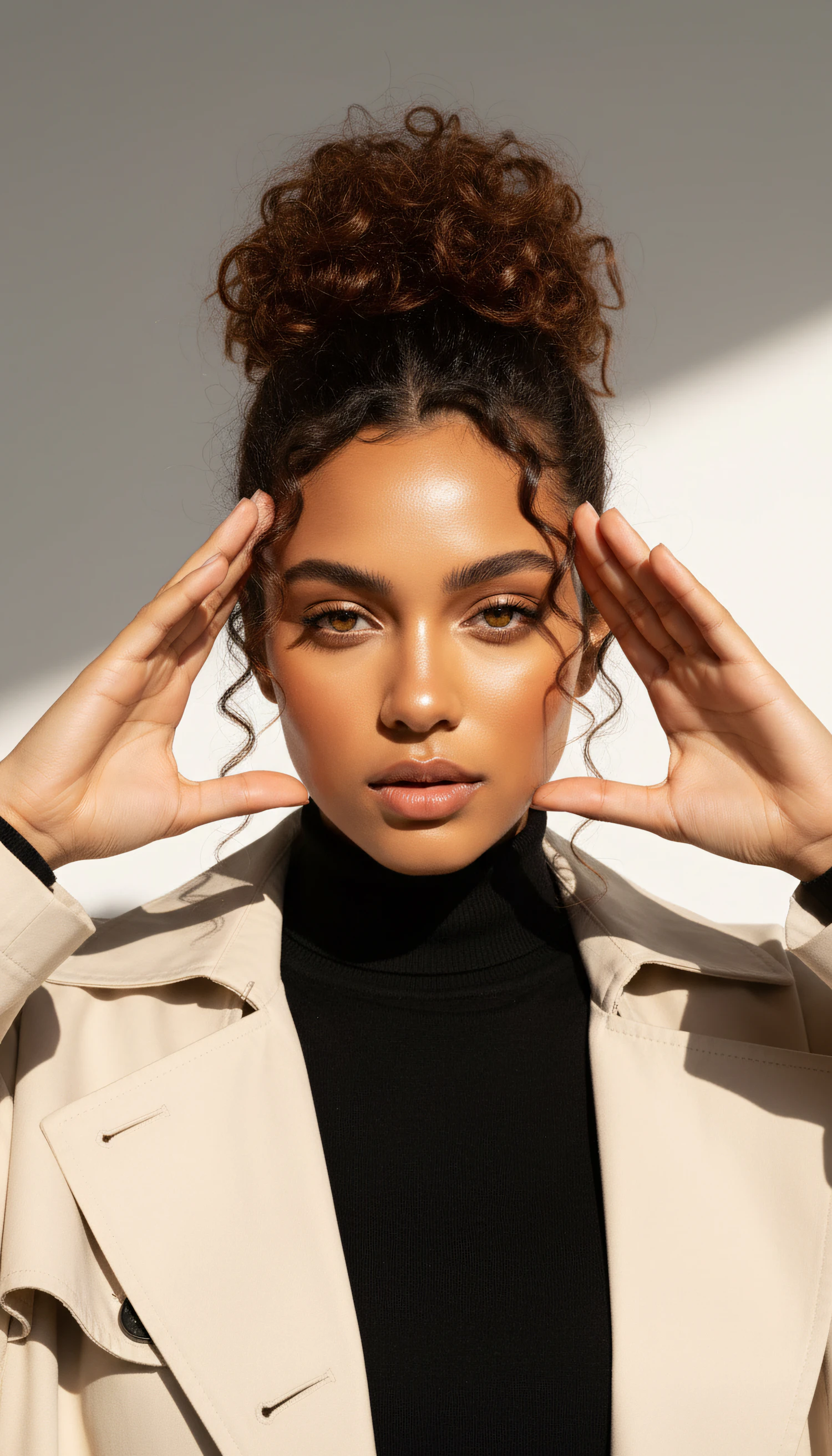 A stylish woman in a beige trench coat and black turtleneck poses with her hands framing her face, highlighting her glowing complexion.