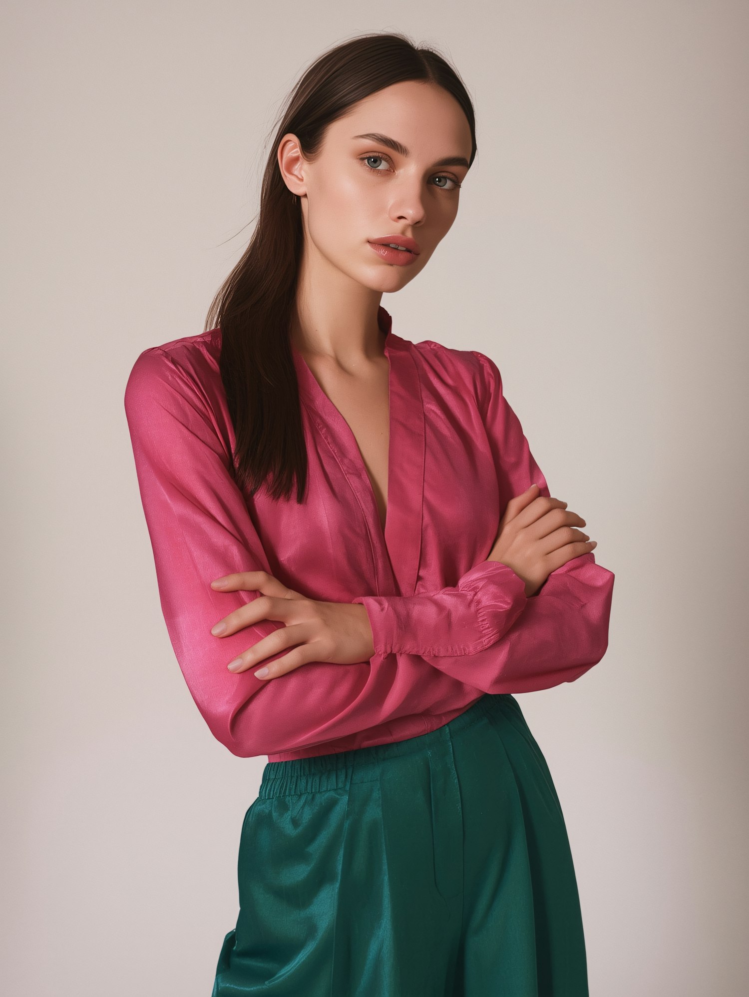 Stylish woman in a pink blouse and green satin trousers, posing confidently against a neutral background.