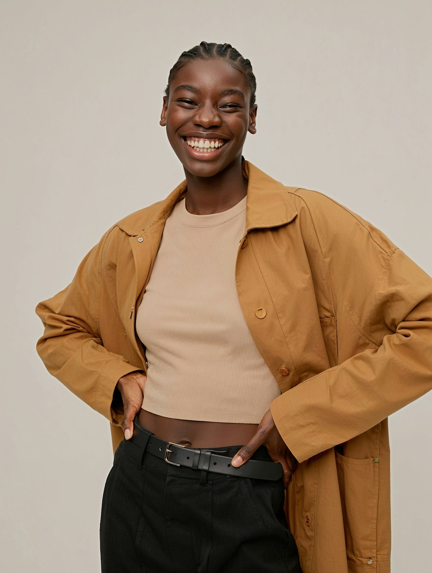 A smiling woman in a mustard jacket, beige crop top, and black trousers exudes confidence against a neutral background.
