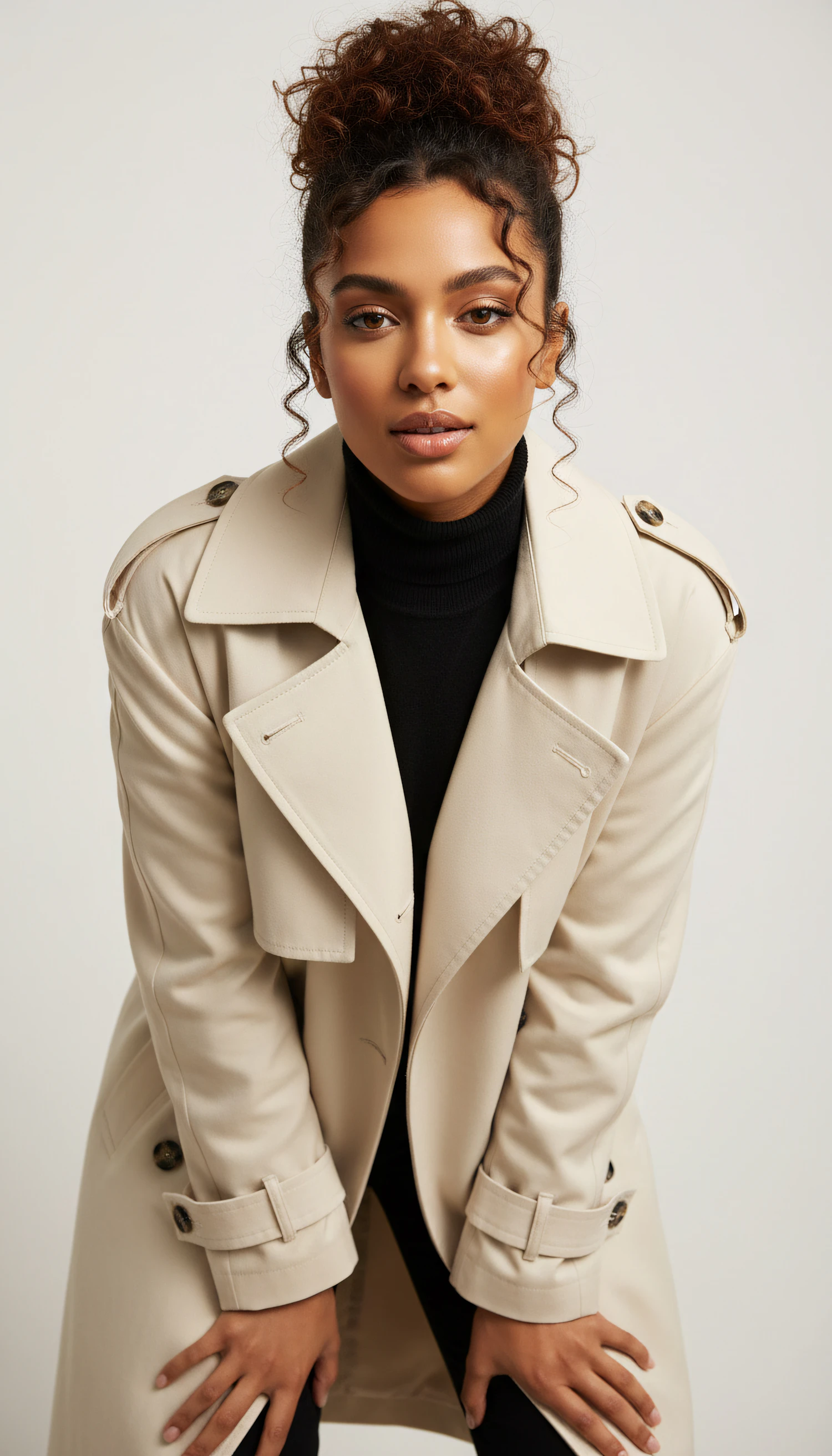 Stylish woman in a beige trench coat and black turtleneck, leaning forward with a confident pose against a neutral background.