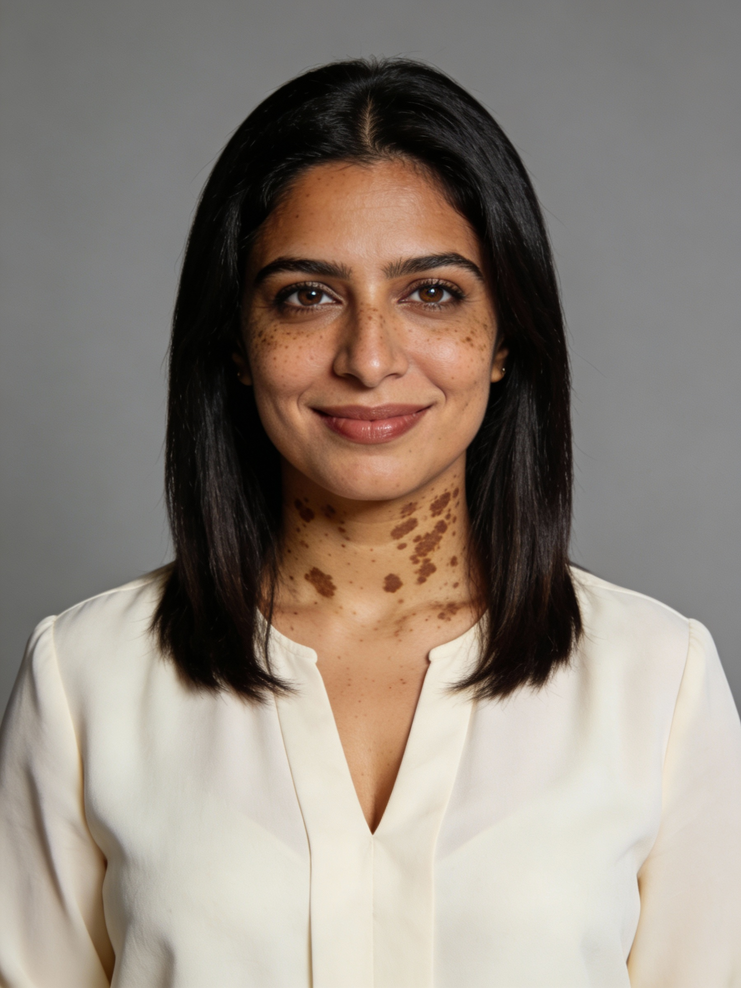 Studio portrait of a Pakistani female operations manager, age 33; medium brown skin with visible vitiligo patches on face and neck; neutral-warm undertone; shoulder-length straight black hair, center part; soft cream blouse with a modest neckline; neutral mid-gray seamless backdrop; Rembrandt lighting with soft fill; 105 mm macro-sharp. Expression: confident and grounded, gentle closed-mouth smile. Framing: portrait orientation, 3:4 ratio; mid-chest-up composition. Subject centered in frame, camera at eye level, facing directly toward the camera (front view). Full head and hair completely inside the frame with a little space above; both shoulders visible, no cropping at the top or sides. Neutral studio composition, no props.