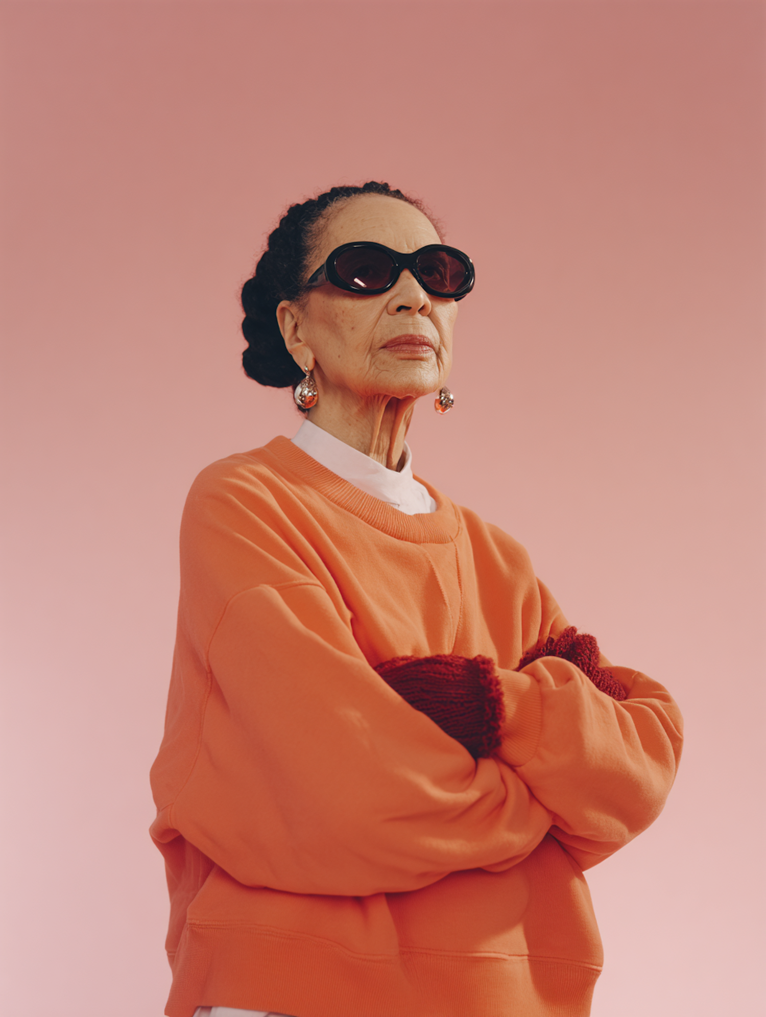 Stylish woman in orange sweatshirt and sunglasses against a pink background, exuding confidence and modern elegance.