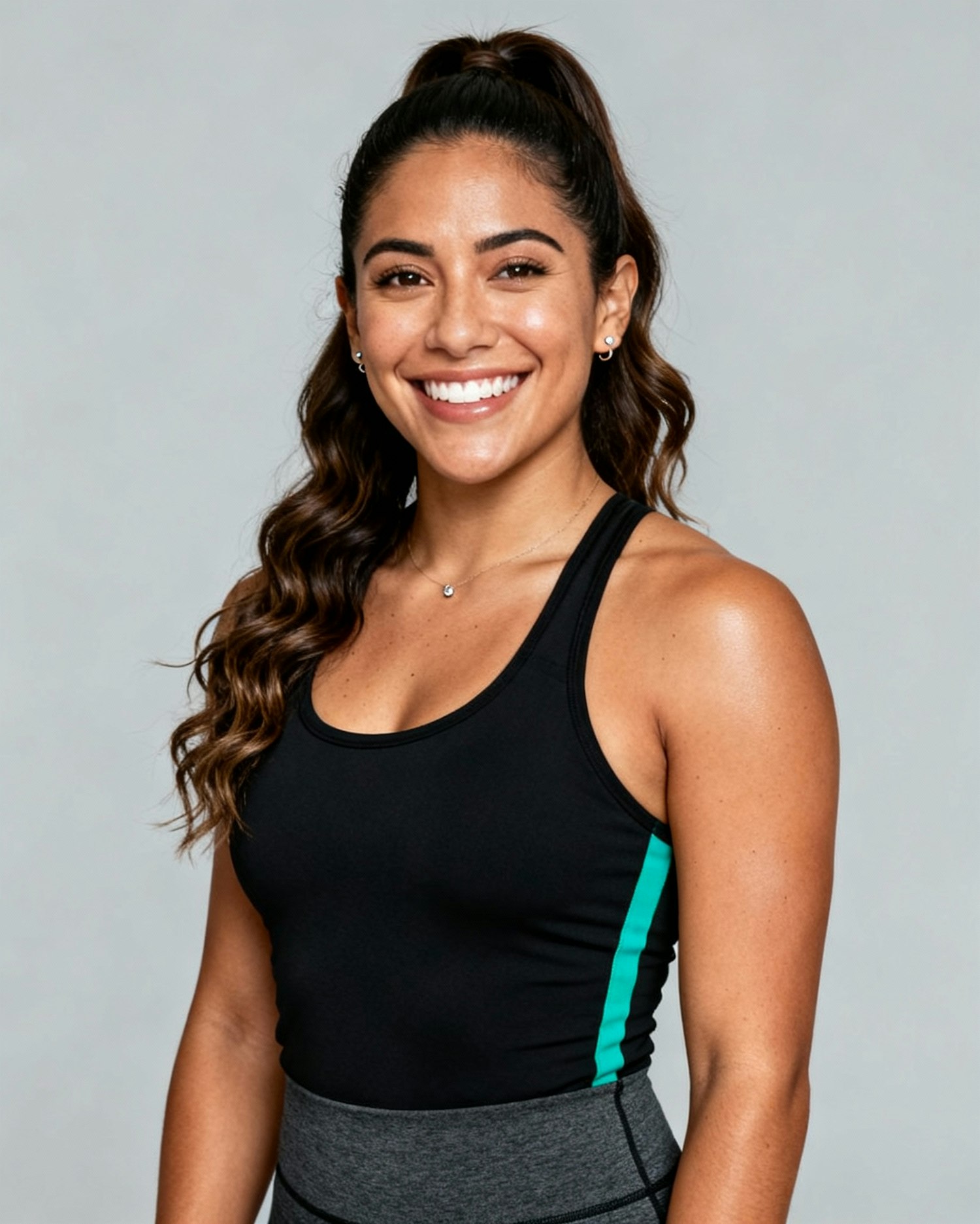 Studio portrait of a Mexican woman spin instructor, age 27; medium-tan skin, neutral-warm; wavy brunette hair in a high ponytail; black racerback performance top with slim emerald side seam (non-branded). Neutral mid-gray seamless; clamshell soft key + gentle rim; crisp white light; 105 mm macro-sharp. Expression: radiant, energetic smile. Skin: smooth, lightly smoothed. Negative as above.Neutral mid-gray seamless backdrop; clamshell soft key + gentle rim; crisp white studio light; 105 mm macro-sharp detail. Framing: head-and-shoulders, eyes to camera. Skin: natural glow, lightly smoothed, no harsh retouch. Expression: warm, confident smile. Wardrobe system: non-branded black performance tops with subtle emerald accents (piping/zip/trim), charcoal bottoms; tidy grooming; simple small jewelry only. Negative: over-retouch, brand logos, watermarks, sweat stains, props, banding.