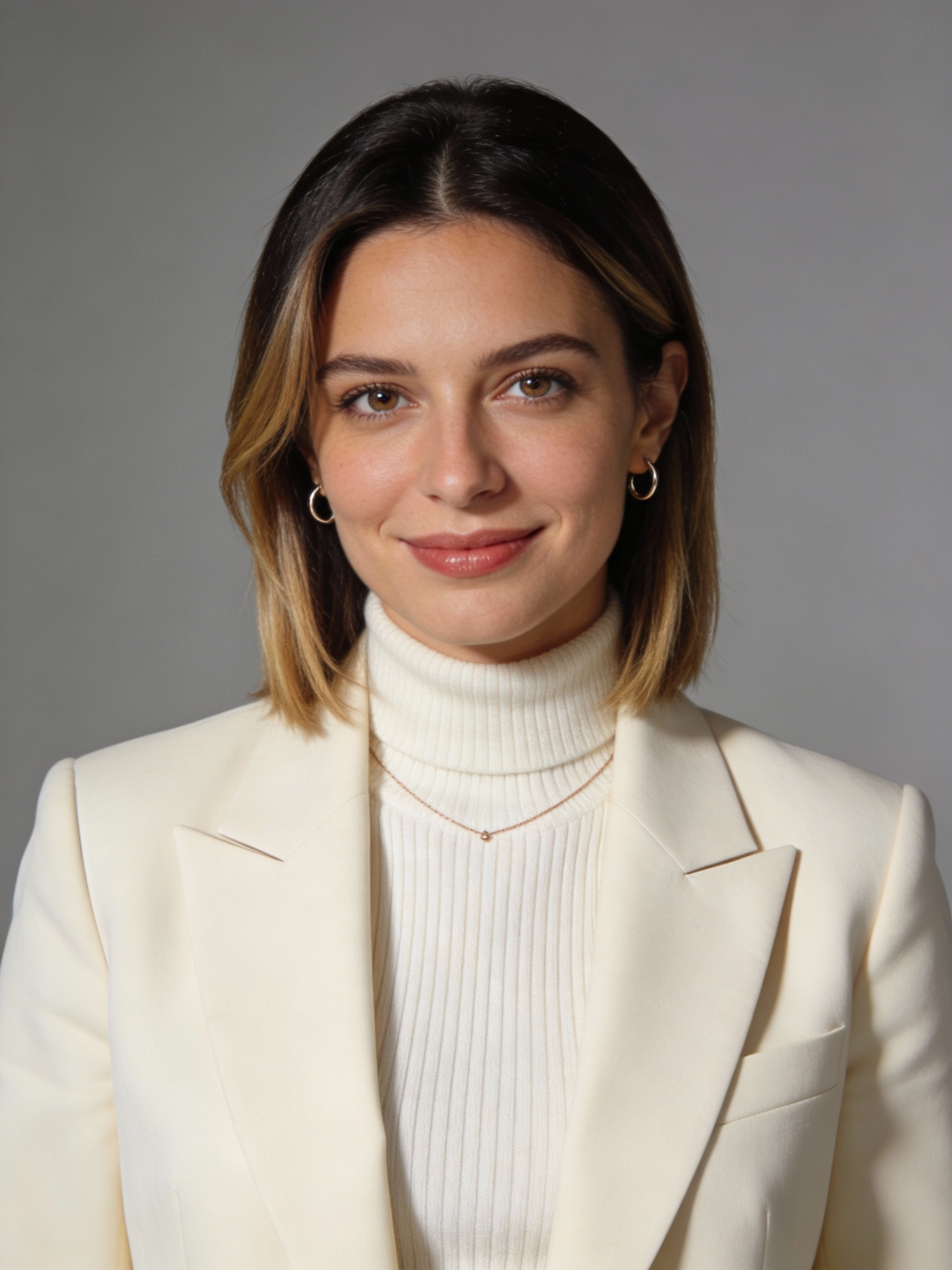 Studio portrait of a Maltese female, age 31; fair skin with neutral undertone; sleek dark blonde lob, slightly off-center part; clean natural makeup. Outfit: cream tailored blazer with sharp lapels over an ivory ribbed turtleneck knit (no logos), quiet-luxury business look. Jewelry: delicate thin necklace + small hoops. Neutral mid-gray seamless backdrop; Rembrandt lighting with soft fill; 105 mm macro-sharp. Expression: warm, poised, gentle closed-mouth smile, clear eyes. Framing: 3:4 portrait, mid-chest-up, centered, eye level, front view; full head inside; shoulders visible. No props, no logos.