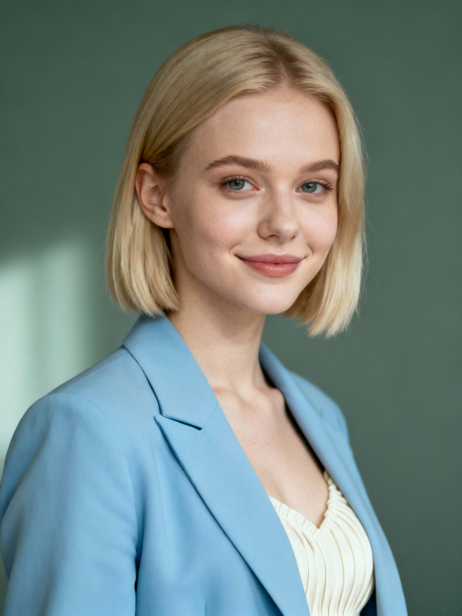 Cinematic studio portrait of an Estonian woman, 22; porcelain skin; short blonde bob; powder-blue blazer, ivory shell. Pose: half profile, soft smile, eyes to lens. Backdrop: cool gray-green, depth blur. Lighting: diffused key 5500K, gentle fill. Camera: 105 mm, f/2.5. Skin: creamy, natural texture. Negative: harsh contrast, brand marks.