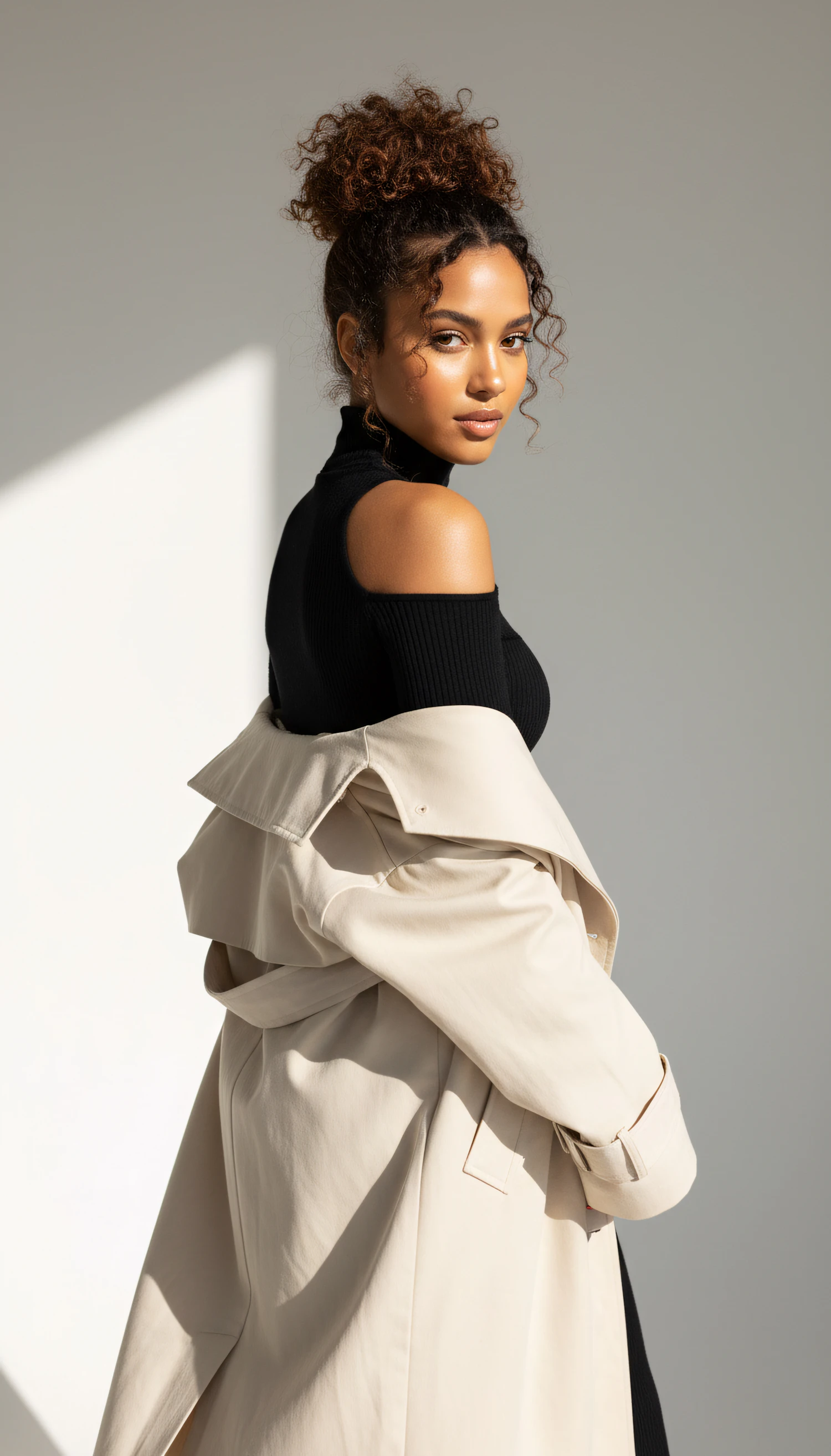 Stylish woman in a black top and beige trench coat, with curly hair in a bun, posing confidently against a neutral background.