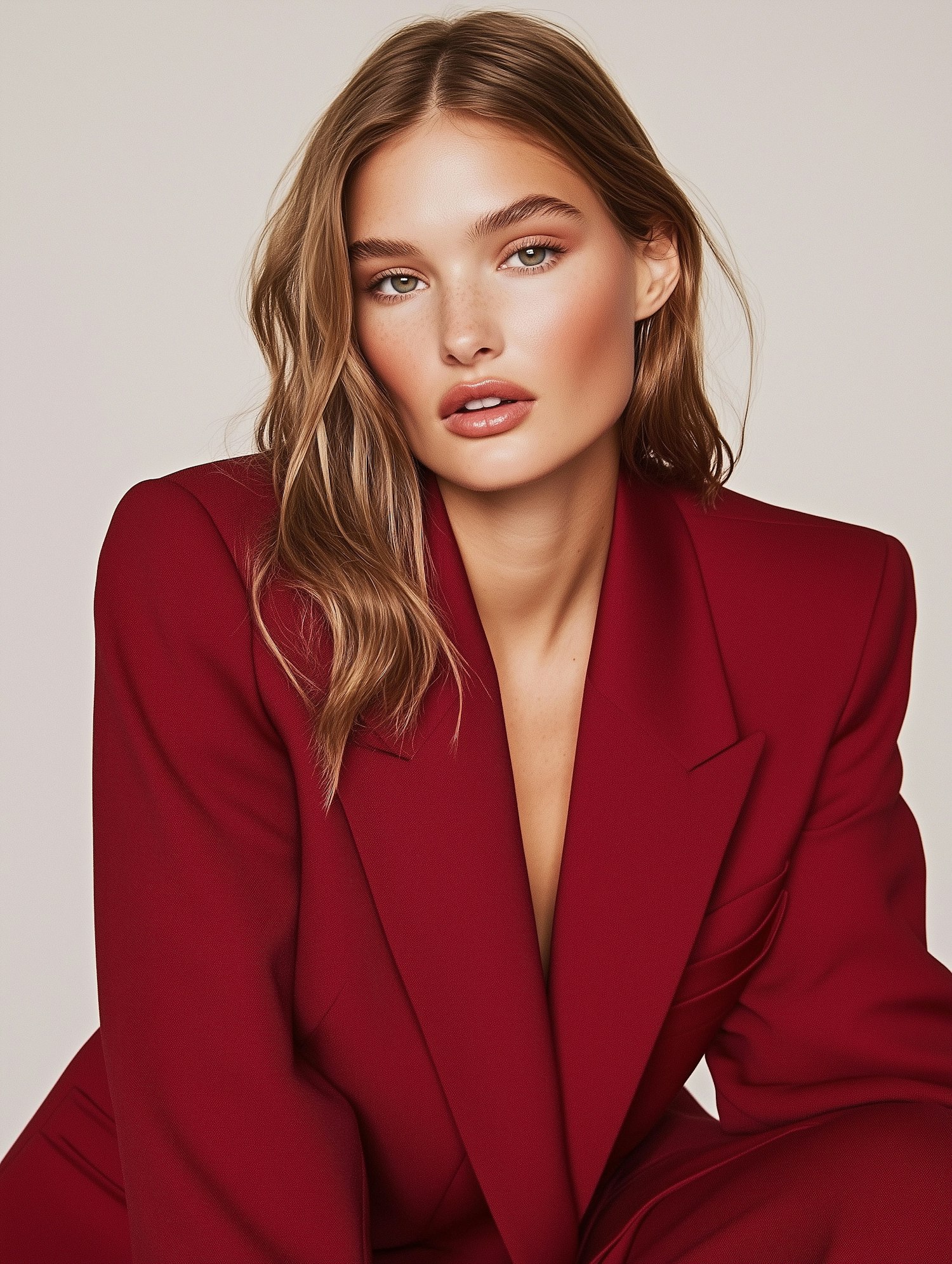 A stylish woman in a deep red blazer with wavy light brown hair and green eyes, set against a neutral beige background.
