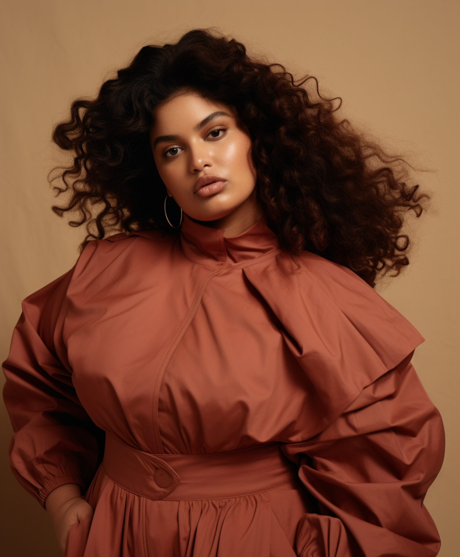 Confident woman with curly hair in a rust-colored outfit, posing against a beige background. Stylish and elegant fashion portrait.