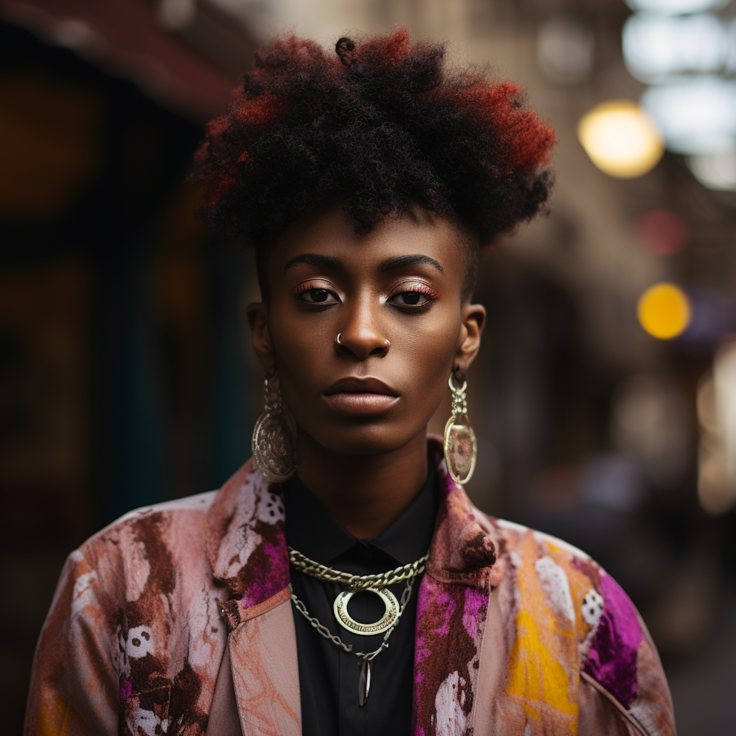 Stylish woman with afro and bold jewelry in urban setting, wearing a colorful jacket and layered necklaces.