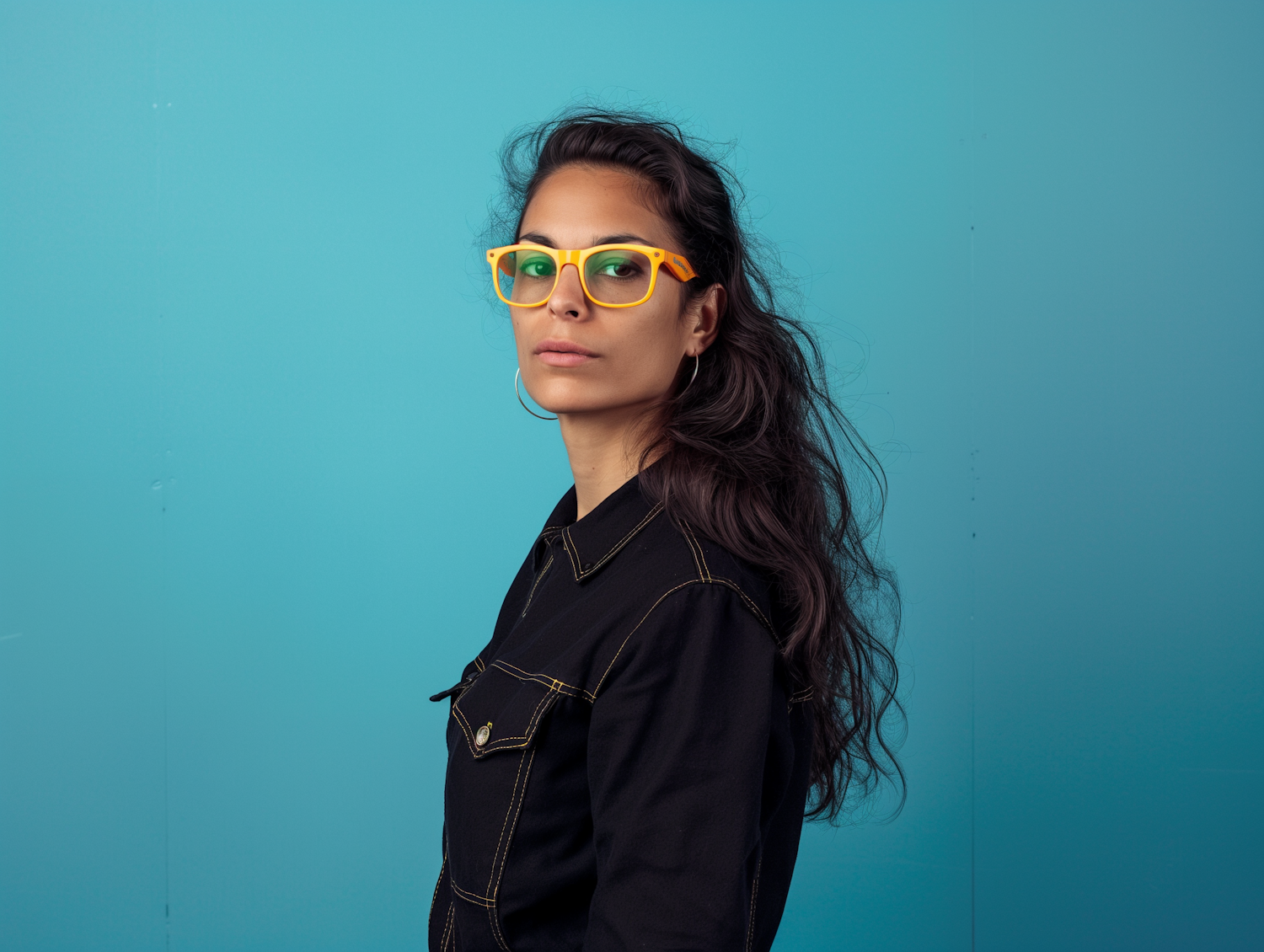 Confident woman with yellow glasses and hoop earrings against a turquoise background, exuding style and elegance.