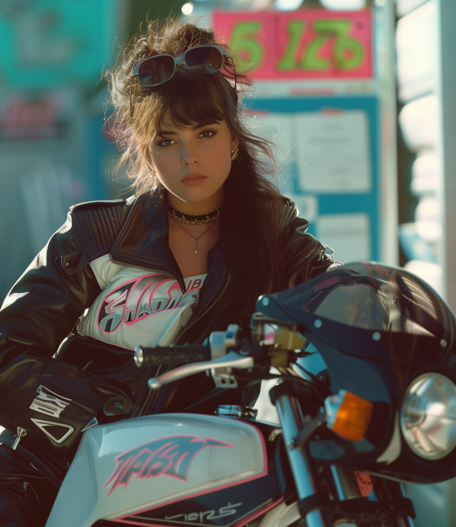 Young woman in a leather jacket on a motorcycle, exuding confidence and style in an urban setting with colorful signs.