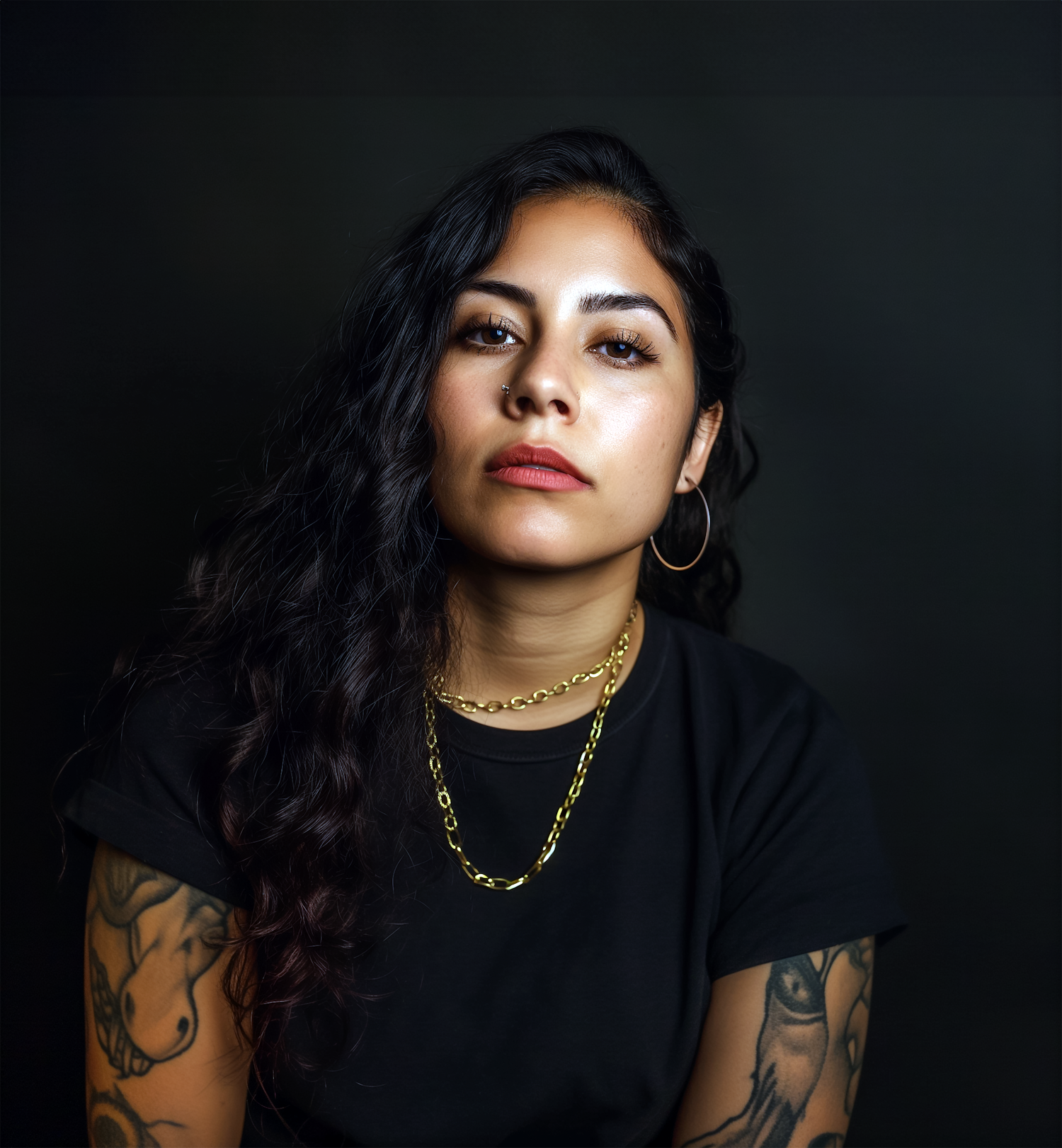 Confident woman with tattoos, hoop earrings, and gold chain necklace against a dark background.
